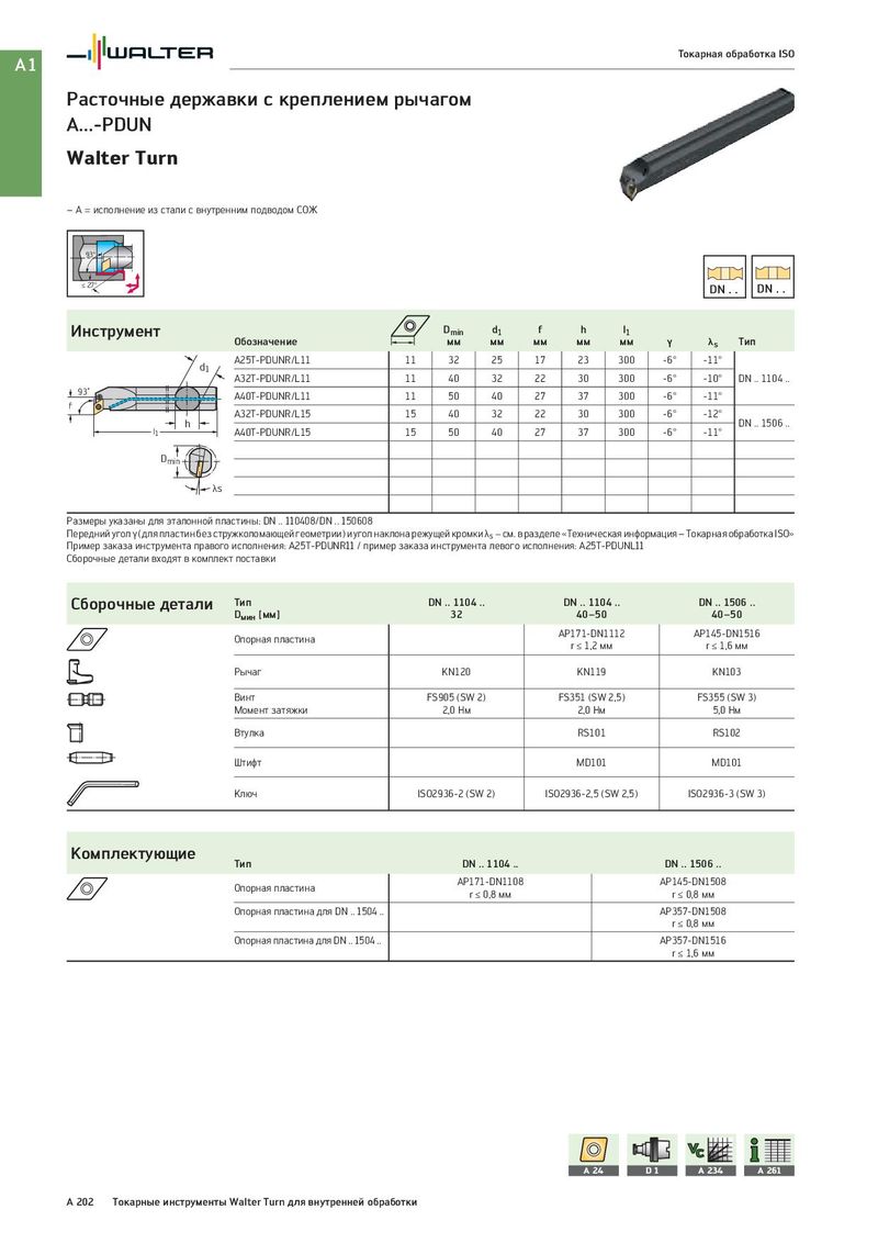A1 Токарная обработка ISO Расточные державки с креплением рычагом A...-PDUN Walter Turn – A = исполнение из стали с внутренним подводом СОЖ 93° ≤ 27° DN . . DN . . Инструмент Dmin d1 f h l1 Обозначение мм мм мм мм мм γ λs Тип d1 A25T-PDUNR/L11 11 32 25 17 23 300 -6° -11° A32T-PDUNR/L11 11 40 32 22 30 300 -6° -10° DN .. 1104 .. 93˚ A40T-PDUNR/L11 11 50 40 27 37 300 -6° -11° f A32T-PDUNR/L15 15 40 32 22 30 300 -6° -12° h DN .. 1506 .. l1 A40T-PDUNR/L15 15 50 40 27 37 300 -6° -11° Dmin λs Размеры указаны для эталонной пластины: DN .. 110408/DN .. 150608 Передний угол γ (для пластин без стружколомающей геометрии) и угол наклона режущей кромки λs − см. в разделе «Техническая информация – Токарная обработка ISO» Пример заказа инструмента правого исполнения: A25T-PDUNR11 / пример заказа инструмента левого исполнения: A25T-PDUNL11 Сборочные детали входят в комплект поставки Сборочные детали Тип DN .. 1104 .. DN .. 1104 .. DN .. 1506 .. Dмин [мм] 32 40–50 40–50 Опорная пластина AP171-DN1112 AP145-DN1516 r ≤ 1,2 мм r ≤ 1,6 мм Рычаг KN120 KN119 KN103 Винт FS905 (SW 2) FS351 (SW 2,5) FS355 (SW 3) Момент затяжки 2,0 Нм 2,0 Нм 5,0 Нм Втулка RS101 RS102 Штифт MD101 MD101 Ключ ISO2936-2 (SW 2) ISO2936-2,5 (SW 2,5) ISO2936-3 (SW 3) Комплектующие Тип DN .. 1104 .. DN .. 1506 .. Опорная пластина AP171-DN1108 AP145-DN1508 r ≤ 0,8 мм r ≤ 0,8 мм Опорная пластина для DN .. 1504 .. AP357-DN1508 r ≤ 0,8 мм Опорная пластина для DN .. 1504 .. AP357-DN1516 r ≤ 1,6 мм A 24 D1 A 234 A 261 A 202 Токарные инструменты Walter Turn для внутренней обработки