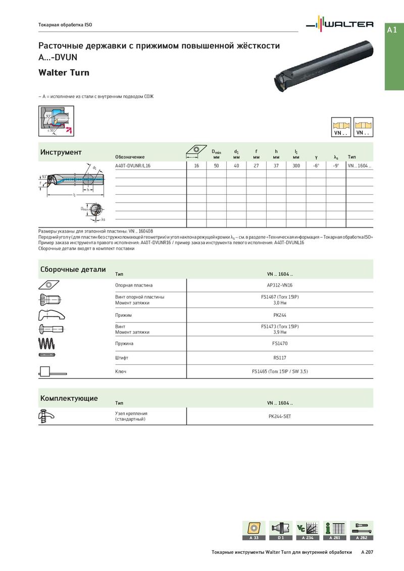 Токарная обработка ISO A1 Расточные державки с прижимом повышенной жёсткости A...-DVUN Walter Turn – A = исполнение из стали с внутренним подводом СОЖ 93° ≤ 50° VN . . VN . . Инструмент Dmin d1 f h l1 Обозначение мм мм мм мм мм γ λs Тип d1 A40T-DVUNR/L16 16 50 40 27 37 300 -6° -9° VN .. 1604 .. 93˚ f h l1 Dmin λs Размеры указаны для эталонной пластины: VN .. 160408 Передний угол γ (для пластин без стружколомающей геометрии) и угол наклона режущей кромки λs − см. в разделе «Техническая информация – Токарная обработка ISO» Пример заказа инструмента правого исполнения: A40T-DVUNR16 / пример заказа инструмента левого исполнения: A40T-DVUNL16 Сборочные детали входят в комплект поставки Сборочные детали Тип VN .. 1604 .. Опорная пластина AP312-VN16 Винт опорной пластины FS1467 (Torx 15IP) Момент затяжки 3,0 Нм Прижим PK244 Винт FS1473 (Torx 15IP) Момент затяжки 3,9 Нм Пружина FS1470 Штифт RS117 Ключ FS1465 (Torx 15IP / SW 3,5) Комплектующие Тип VN .. 1604 .. Узел крепления PK244-SET (стандартный) A 33 D1 A 234 A 261 A 262 Токарные инструменты Walter Turn для внутренней обработки A 207