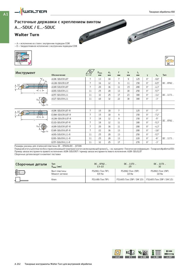 A1 Токарная обработка ISO Расточные державки с креплением винтом A...-SDUC / E...-SDUC Walter Turn – A = исполнение из стали с внутренним подводом СОЖ – E = твердосплавное исполнение с внутренним подводом СОЖ 93° 7° ≤ 30° DC . . Инструмент Dmin d1 f h l1 Обозначение мм мм мм мм мм γ λs Тип d1 A10K-SDUCR/L07 7 13 10 7 9 125 0° -9,0° A12M-SDUCR/L07 7 16 12 9 11 150 0° -6,5° DC .. 0702 .. 93˚ f A16R-SDUCR/L07 7 20 16 11 15 200 0° -4,3° h A20S-SDUCR/L11 11 25 20 13 18 250 0° -5,7° l1 A25T-SDUCR/L11 11 32 25 17 23 300 0° -3,4° DC .. 11T3 .. Dmin A32T-SDUCR/L11 11 40 32 22 30 300 0° -3° λs 93˚ A10K-SDUCR/L07-R 7 15 10 7 125 0° -7° f E10M-SDUCR/L07-R 7 15 10 9 150 0° -7,2° d1 A12M-SDUCR/L07-R 7 18 12 9 150 0° -5° l1 DC .. 0702 .. E12Q-SDUCR/L07-R 7 18 12 11 180 0° -5,3° Dmin A16R-SDUCR/L07-R 7 20 16 11 200 0° -4,3° λs E16R-SDUCR/L07-R 7 22 16 13 200 0° -3,6° A20S-SDUCR/L11-R 11 25 20 13 250 0° -5,7° E20S-SDUCR/L11-R 11 25 20 13 220 0° -6° DC .. 11T3 .. E25T-SDUCR/L11-R 11 32 25 17 270 0° -3° Размеры указаны для эталонной пластины: DC .. 070204/DC .. 11T308 Передний угол γ (для пластин без стружколомающей геометрии) и угол наклона режущей кромки λs − см. в разделе «Техническая информация – Токарная обработка ISO» Пример заказа инструмента правого исполнения: A10K-SDUCR07 / пример заказа инструмента левого исполнения: A10K-SDUCL07 Сборочные детали входят в комплект поставки Сборочные детали Тип DC .. 0702 .. DC .. 11T3 .. DC .. 11T3 .. Dмин [мм] 13–22 25 32 Винт пластины FS2061 (Torx 7IP) FS2062 (Torx 15IP) FS2063 (Torx 15IP) Момент затяжки 0,9 Нм 3,0 Нм 3,0 Нм Ключ FS1490 (Torx 7IP) FS1465 (Torx 15IP / SW 3,5) FS1465 (Torx 15IP / SW 3,5) A 42 D1 A 238 A 261 A 267 A 212 Токарные инструменты Walter Turn для внутренней обработки