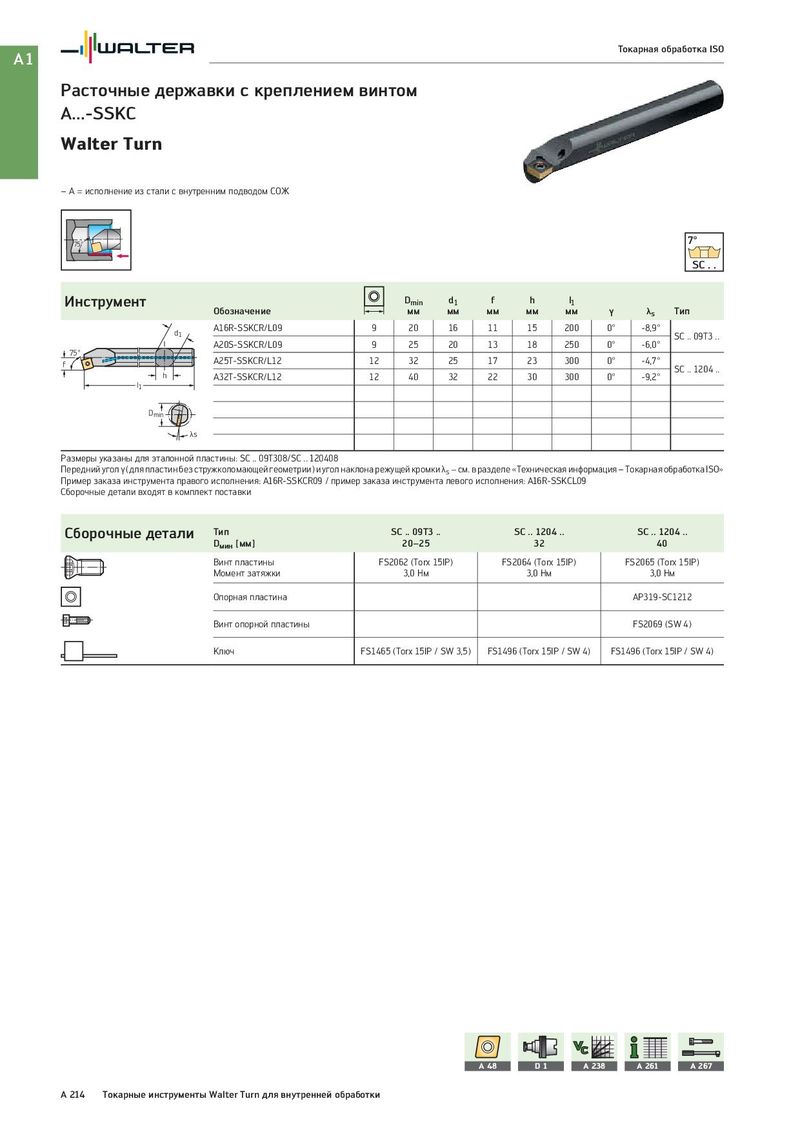 A1 Токарная обработка ISO Расточные державки с креплением винтом A...-SSKC Walter Turn – A = исполнение из стали с внутренним подводом СОЖ 75° 7° SC . . Инструмент Dmin d1 f h l1 Обозначение мм мм мм мм мм γ λs Тип d1 A16R-SSKCR/L09 9 20 16 11 15 200 0° -8,9° SC .. 09T3 .. A20S-SSKCR/L09 9 25 20 13 18 250 0° -6,0° 75° f A25T-SSKCR/L12 12 32 25 17 23 300 0° -4,7° h SC .. 1204 .. l1 A32T-SSKCR/L12 12 40 32 22 30 300 0° -9,2° Dmin λs Размеры указаны для эталонной пластины: SC .. 09T308/SC .. 120408 Передний угол γ (для пластин без стружколомающей геометрии) и угол наклона режущей кромки λs − см. в разделе «Техническая информация – Токарная обработка ISO» Пример заказа инструмента правого исполнения: A16R-SSKCR09 / пример заказа инструмента левого исполнения: A16R-SSKCL09 Сборочные детали входят в комплект поставки Сборочные детали Тип SC .. 09T3 .. SC .. 1204 .. SC .. 1204 .. Dмин [мм] 20–25 32 40 Винт пластины FS2062 (Torx 15IP) FS2064 (Torx 15IP) FS2065 (Torx 15IP) Момент затяжки 3,0 Нм 3,0 Нм 3,0 Нм Опорная пластина AP319-SC1212 Винт опорной пластины FS2069 (SW 4) Ключ FS1465 (Torx 15IP / SW 3,5) FS1496 (Torx 15IP / SW 4) FS1496 (Torx 15IP / SW 4) A 48 D1 A 238 A 261 A 267 A 214 Токарные инструменты Walter Turn для внутренней обработки
