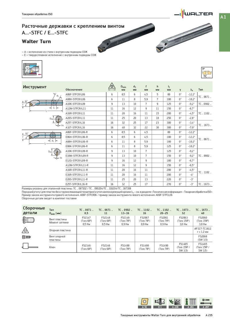Токарная обработка ISO A1 Расточные державки с креплением винтом A...-STFC / E...-STFC Walter Turn – A = исполнение из стали с внутренним подводом СОЖ – E = твердосплавное исполнение с внутренним подводом СОЖ 91° 7° TC . . Инструмент Dmin d1 f h l1 Обозначение мм мм мм мм мм γ λs Тип d1 A06F-STFCR/L06 6 8,5 6 4,5 5 80 0° -12,2° TC .. 06T1 .. 91˚ A08H-STFCR/L06 6 11 8 5,9 7 100 0° -10,2° f A10K-STFCR/L09 9 13 10 7 9 125 0° -9,2° TC .. 0902 .. h A12M-STFCR/L11 11 16 12 9 11 150 0° -6,7° l1 A16R-STFCR/L11 11 20 16 11 15 200 0° -4,5° TC .. 1102 .. Dmin A20S-STFCR/L11 11 25 20 13 18 250 0° -2,8° A25T-STFCR/L16 16 32 25 17 23 300 0° -3,4° λs TC .. 16T3 .. A32T-STFCR/L16 16 40 32 22 30 300 0° -7,9° 91˚ A06F-STFCR/L06-R 6 8,5 6 4,5 80 0° -12,2° f E06H-STFCR/L06-R 6 8,5 6 4,5 100 0° -12,2° d1 TC .. 06T1 .. l1 A08H-STFCR/L06-R 6 11 8 5,9 100 0° -10,2° E08K-STFCR/L06-R 6 11 8 5,9 125 0° -10,2° Dmin A10K-STFCR/L09-R 9 13 10 7 125 0° -9,2° λs E10M-STFCR/L09-R 9 13 10 7 150 0° -9,2° TC .. 0902 .. E12Q-STFCR/L09-R 9 16 12 9 180 0° -6,7° A12M-STFCR/L11-R 11 16 12 9 150 0° -6,5° A16R-STFCR/L11-R 11 20 16 11 200 0° -4,5° TC .. 1102 .. E16R-STFCR/L11-R 11 20 16 11 200 0° -4° E20S-STFCR/L11-R 11 25 20 13 220 0° -3° E25T-STFCR/L16-R 16 32 25 17 270 0° -3° TC .. 16T3 .. Размеры указаны для эталонной пластины: TC .. 06T102 / TC .. 090204/TC .. 110204/TC .. 16T308 Передний угол γ (для пластин без стружколомающей геометрии) и угол наклона режущей кромки λs − см. в разделе «Техническая информация – Токарная обработка ISO» Пример заказа инструмента правого исполнения: A06F-STFCR06 / пример заказа инструмента левого исполнения: A06F-STFCL06 Сборочные детали входят в комплект поставки Сборочные Тип TC .. 06T1 .. TC .. 06T1 .. TC .. 0902 .. TC .. 1102 .. TC .. 1102 .. TC .. 16T3 .. TC .. 16T3 .. детали Dмин [мм] 8,5 11 13–16 16 20–25 32 40 Винт пластины FS2147 FS2148 FS2149 FS2067 FS2061 FS2063 FS2060 Момент затяжки (Torx 6IP) (Torx 6IP) (Torx 7IP) (Torx 7IP) (Torx 7IP) (Torx 15IP) (Torx 15IP) 0,5 Нм 0,5 Нм 0,9 Нм 0,9 Нм 0,9 Нм 3,0 Нм 3,0 Нм Опорная пластина AP317-TC1612 r ≤ 1,2 мм Винт опорной FS2068 пластины (SW 3,5) FS2146 FS2146 FS1490 FS1490 FS1490 FS1465 FS1465 Ключ (Torx 6IP) (Torx 6IP) (Torx 7IP) (Torx 7IP) (Torx 7IP) (Torx 15IP / (Torx 15IP / SW 3,5) SW 3,5) A 51 D1 A 238 A 261 A 267 Токарные инструменты Walter Turn для внутренней обработки A 215
