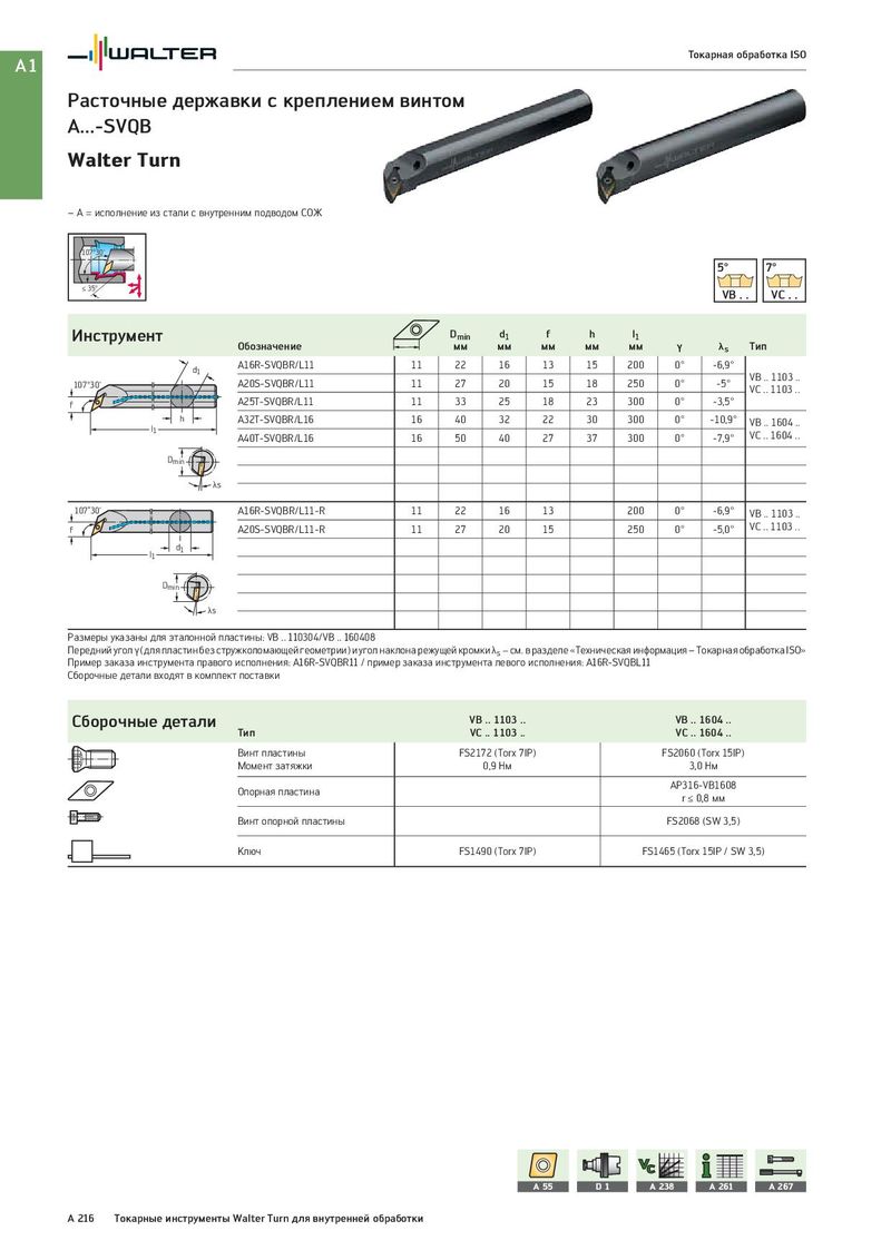 A1 Токарная обработка ISO Расточные державки с креплением винтом A...-SVQB Walter Turn – A = исполнение из стали с внутренним подводом СОЖ 107°30‘ 5° 7° ≤ 35° VB . . VC . . Инструмент Dmin d1 f h l1 Обозначение мм мм мм мм мм γ λs Тип d1 A16R-SVQBR/L11 11 22 16 13 15 200 0° -6,9° 107°30' A20S-SVQBR/L11 11 27 20 15 18 250 0° -5° VB .. 1103 .. VC .. 1103 .. f A25T-SVQBR/L11 11 33 25 18 23 300 0° -3,5° h A32T-SVQBR/L16 16 40 32 22 30 300 0° -10,9° VB .. 1604 .. l1 A40T-SVQBR/L16 16 50 40 27 37 300 0° -7,9° VC .. 1604 .. Dmin λs 107˚30' A16R-SVQBR/L11-R 11 22 16 13 200 0° -6,9° VB .. 1103 .. f A20S-SVQBR/L11-R 11 27 20 15 250 0° -5,0° VC .. 1103 .. l1 d1 Dmin λs Размеры указаны для эталонной пластины: VB .. 110304/VB .. 160408 Передний угол γ (для пластин без стружколомающей геометрии) и угол наклона режущей кромки λs − см. в разделе «Техническая информация – Токарная обработка ISO» Пример заказа инструмента правого исполнения: A16R-SVQBR11 / пример заказа инструмента левого исполнения: A16R-SVQBL11 Сборочные детали входят в комплект поставки Сборочные детали VB .. 1103 .. VB .. 1604 .. Тип VC .. 1103 .. VC .. 1604 .. Винт пластины FS2172 (Torx 7IP) FS2060 (Torx 15IP) Момент затяжки 0,9 Нм 3,0 Нм Опорная пластина AP316-VB1608 r ≤ 0,8 мм Винт опорной пластины FS2068 (SW 3,5) Ключ FS1490 (Torx 7IP) FS1465 (Torx 15IP / SW 3,5) A 55 D1 A 238 A 261 A 267 A 216 Токарные инструменты Walter Turn для внутренней обработки