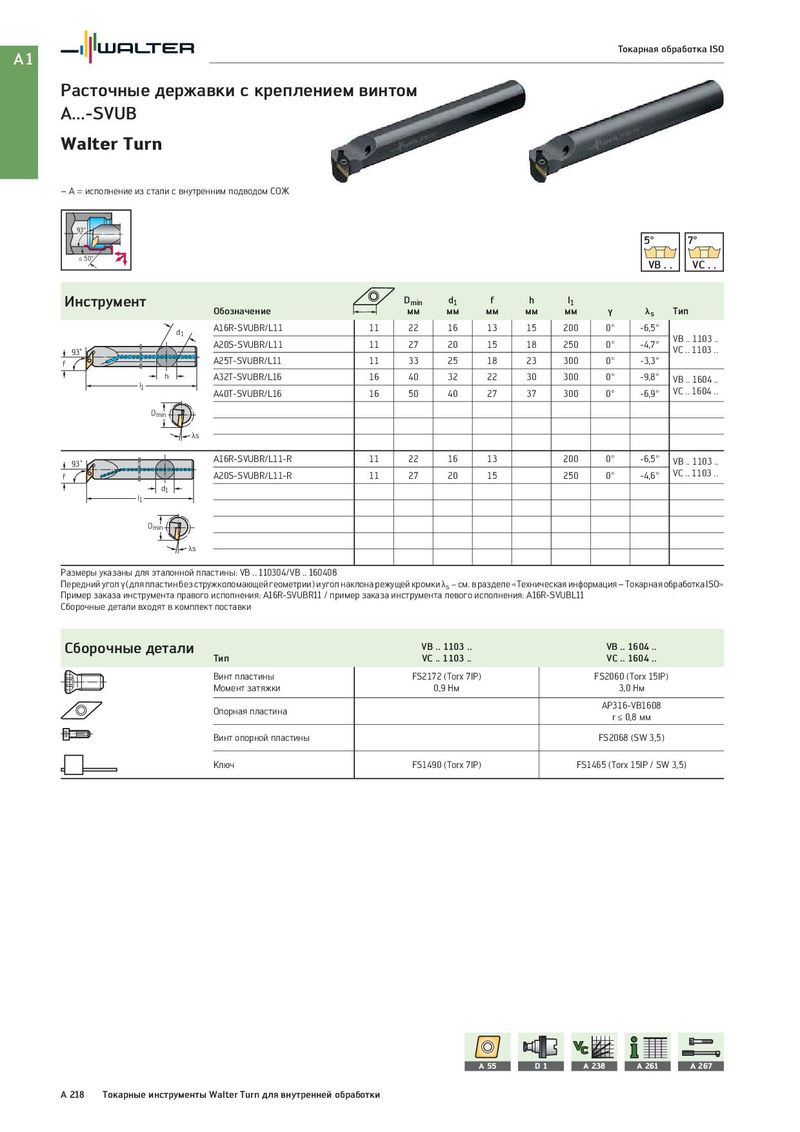 A1 Токарная обработка ISO Расточные державки с креплением винтом A...-SVUB Walter Turn – A = исполнение из стали с внутренним подводом СОЖ 93° 5° 7° ≤ 50° VB . . VC . . Инструмент Dmin d1 f h l1 Обозначение мм мм мм мм мм γ λs Тип d1 A16R-SVUBR/L11 11 22 16 13 15 200 0° -6,5° A20S-SVUBR/L11 11 27 20 15 18 250 0° -4,7° VB .. 1103 .. 93˚ VC .. 1103 .. f A25T-SVUBR/L11 11 33 25 18 23 300 0° -3,3° h A32T-SVUBR/L16 16 40 32 22 30 300 0° -9,8° VB .. 1604 .. l1 A40T-SVUBR/L16 16 50 40 27 37 300 0° -6,9° VC .. 1604 .. Dmin λs 93˚ A16R-SVUBR/L11-R 11 22 16 13 200 0° -6,5° VB .. 1103 .. f A20S-SVUBR/L11-R 11 27 20 15 250 0° -4,6° VC .. 1103 .. d1 l1 Dmin λs Размеры указаны для эталонной пластины: VB .. 110304/VB .. 160408 Передний угол γ (для пластин без стружколомающей геометрии) и угол наклона режущей кромки λs − см. в разделе «Техническая информация – Токарная обработка ISO» Пример заказа инструмента правого исполнения: A16R-SVUBR11 / пример заказа инструмента левого исполнения: A16R-SVUBL11 Сборочные детали входят в комплект поставки Сборочные детали VB .. 1103 .. VB .. 1604 .. Тип VC .. 1103 .. VC .. 1604 .. Винт пластины FS2172 (Torx 7IP) FS2060 (Torx 15IP) Момент затяжки 0,9 Нм 3,0 Нм Опорная пластина AP316-VB1608 r ≤ 0,8 мм Винт опорной пластины FS2068 (SW 3,5) Ключ FS1490 (Torx 7IP) FS1465 (Torx 15IP / SW 3,5) A 55 D1 A 238 A 261 A 267 A 218 Токарные инструменты Walter Turn для внутренней обработки