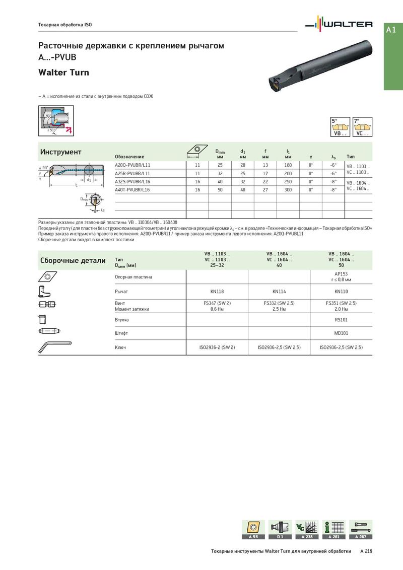 Токарная обработка ISO A1 Расточные державки с креплением рычагом A...-PVUB Walter Turn – A = исполнение из стали с внутренним подводом СОЖ 93° 5° 7° ≤ 50° VB . . VC . . Инструмент Dmin d1 f l1 Обозначение мм мм мм мм γ λs Тип 93˚ A20Q-PVUBR/L11 11 25 20 13 180 0° -6° VB .. 1103 .. f A25R-PVUBR/L11 11 32 25 17 200 0° -6° VC .. 1103 .. d1 A32S-PVUBR/L16 16 40 32 22 250 0° -8° VB .. 1604 .. l1 VC .. 1604 .. A40T-PVUBR/L16 16 50 40 27 300 0° -8° Dmin λs Размеры указаны для эталонной пластины: VB .. 110304/VB .. 160408 Передний угол γ (для пластин без стружколомающей геометрии) и угол наклона режущей кромки λs − см. в разделе «Техническая информация – Токарная обработка ISO» Пример заказа инструмента правого исполнения: A20Q-PVUBR11 / пример заказа инструмента левого исполнения: A20Q-PVUBL11 Сборочные детали входят в комплект поставки VB .. 1103 .. VB .. 1604 .. VB .. 1604 .. Сборочные детали Тип VC .. 1103 .. VC .. 1604 .. VC .. 1604 .. Dмин [мм] 25–32 40 50 Опорная пластина AP153 r ≤ 0,8 мм Рычаг KN118 KN114 KN110 Винт FS347 (SW 2) FS332 (SW 2,5) FS351 (SW 2,5) Момент затяжки 0,6 Нм 2,5 Нм 2,0 Нм Втулка RS101 Штифт MD101 Ключ ISO2936-2 (SW 2) ISO2936-2,5 (SW 2,5) ISO2936-2,5 (SW 2,5) A 55 D1 A 238 A 261 A 267 Токарные инструменты Walter Turn для внутренней обработки A 219