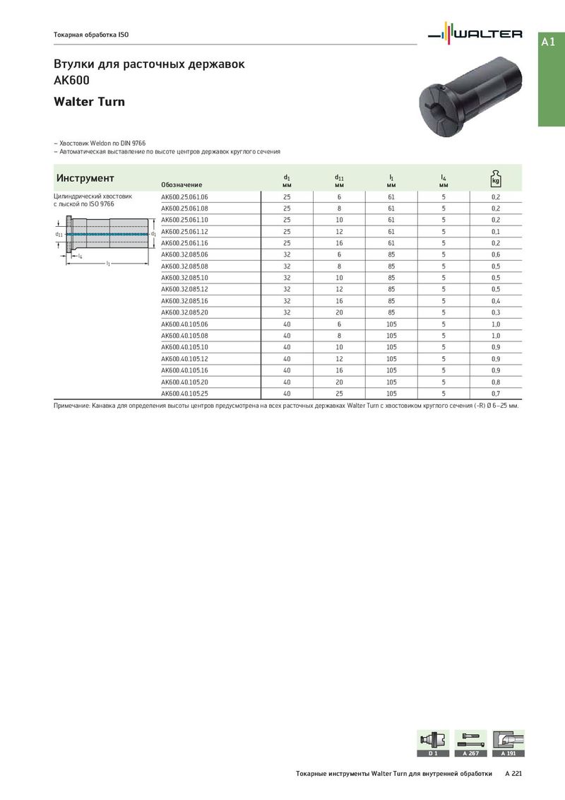 Токарная обработка ISO A1 Втулки для расточных державок AK600 Walter Turn – Хвостовик Weldon по DIN 9766 – Автоматическая выставление по высоте центров державок круглого сечения Инструмент d1 d11 l1 l4 Обозначение мм мм мм мм Цилиндрический хвостовик AK600.25.061.06 25 6 61 5 0,2 с лыской по ISO 9766 AK600.25.061.08 25 8 61 5 0,2 AK600.25.061.10 25 10 61 5 0,2 d11 d1 AK600.25.061.12 25 12 61 5 0,1 AK600.25.061.16 25 16 61 5 0,2 l4 AK600.32.085.06 32 6 85 5 0,6 l1 AK600.32.085.08 32 8 85 5 0,5 AK600.32.085.10 32 10 85 5 0,5 AK600.32.085.12 32 12 85 5 0,5 AK600.32.085.16 32 16 85 5 0,4 AK600.32.085.20 32 20 85 5 0,3 AK600.40.105.06 40 6 105 5 1,0 AK600.40.105.08 40 8 105 5 1,0 AK600.40.105.10 40 10 105 5 0,9 AK600.40.105.12 40 12 105 5 0,9 AK600.40.105.16 40 16 105 5 0,9 AK600.40.105.20 40 20 105 5 0,8 AK600.40.105.25 40 25 105 5 0,7 Примечание: Канавка для определения высоты центров предусмотрена на всех расточных державках Walter Turn с хвостовиком круглого сечения (-R) Ø 6−25 мм. D1 A 267 A 191 Токарные инструменты Walter Turn для внутренней обработки A 221