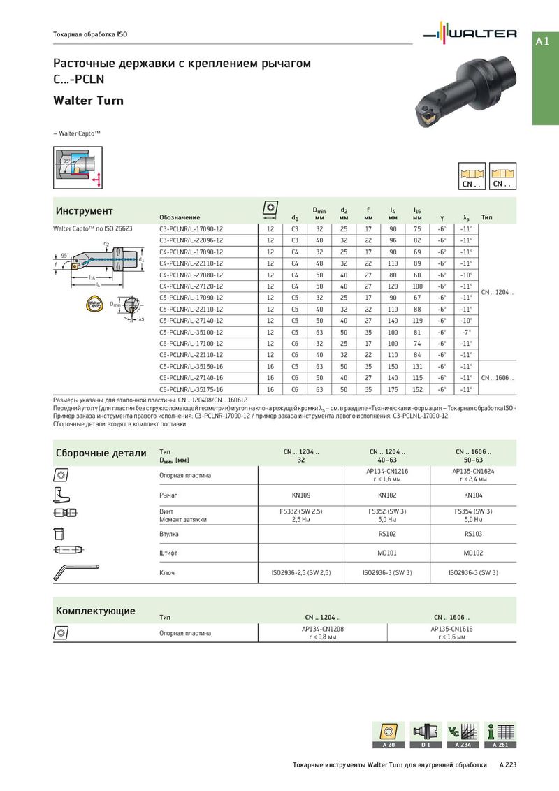Токарная обработка ISO A1 Расточные державки с креплением рычагом C...-PCLN Walter Turn – Walter Capto™ 95° CN . . CN . . Инструмент Dmin d2 f l4 l16 Обозначение d1 мм мм мм мм мм γ λs Тип Walter Capto™ по ISO 26623 C3-PCLNR/L-17090-12 12 C3 32 25 17 90 75 -6° -11° d2 C3-PCLNR/L-22096-12 12 C3 40 32 22 96 82 -6° -11° 95˚ C4-PCLNR/L-17090-12 12 C4 32 25 17 90 69 -6° -11° f d1 C4-PCLNR/L-22110-12 12 C4 40 32 22 110 89 -6° -11° l16 C4-PCLNR/L-27080-12 12 C4 50 40 27 80 60 -6° -10° l4 C4-PCLNR/L-27120-12 12 C4 50 40 27 120 100 -6° -11° CN .. 1204 .. C5-PCLNR/L-17090-12 12 C5 32 25 17 90 67 -6° -11° Dmin C5-PCLNR/L-22110-12 12 C5 40 32 22 110 88 -6° -11° λs C5-PCLNR/L-27140-12 12 C5 50 40 27 140 119 -6° -10° C5-PCLNR/L-35100-12 12 C5 63 50 35 100 81 -6° -7° C6-PCLNR/L-17100-12 12 C6 32 25 17 100 74 -6° -11° C6-PCLNR/L-22110-12 12 C6 40 32 22 110 84 -6° -11° C5-PCLNR/L-35150-16 16 C5 63 50 35 150 131 -6° -11° C6-PCLNR/L-27140-16 16 C6 50 40 27 140 115 -6° -11° CN .. 1606 .. C6-PCLNR/L-35175-16 16 C6 63 50 35 175 152 -6° -11° Размеры указаны для эталонной пластины: CN .. 120408/CN .. 160612 Передний угол γ (для пластин без стружколомающей геометрии) и угол наклона режущей кромки λs − см. в разделе «Техническая информация – Токарная обработка ISO» Пример заказа инструмента правого исполнения: C3-PCLNR-17090-12 / пример заказа инструмента левого исполнения: C3-PCLNL-17090-12 Сборочные детали входят в комплект поставки Сборочные детали Тип CN .. 1204 .. CN .. 1204 .. CN .. 1606 .. Dмин [мм] 32 40–63 50–63 Опорная пластина AP134-CN1216 AP135-CN1624 r ≤ 1,6 мм r ≤ 2,4 мм Рычаг KN109 KN102 KN104 Винт FS332 (SW 2,5) FS352 (SW 3) FS354 (SW 3) Момент затяжки 2,5 Нм 5,0 Нм 5,0 Нм Втулка RS102 RS103 Штифт MD101 MD102 Ключ ISO2936-2,5 (SW 2,5) ISO2936-3 (SW 3) ISO2936-3 (SW 3) Комплектующие Тип CN .. 1204 .. CN .. 1606 .. Опорная пластина AP134-CN1208 AP135-CN1616 r ≤ 0,8 мм r ≤ 1,6 мм A 20 D1 A 234 A 261 Токарные инструменты Walter Turn для внутренней обработки A 223