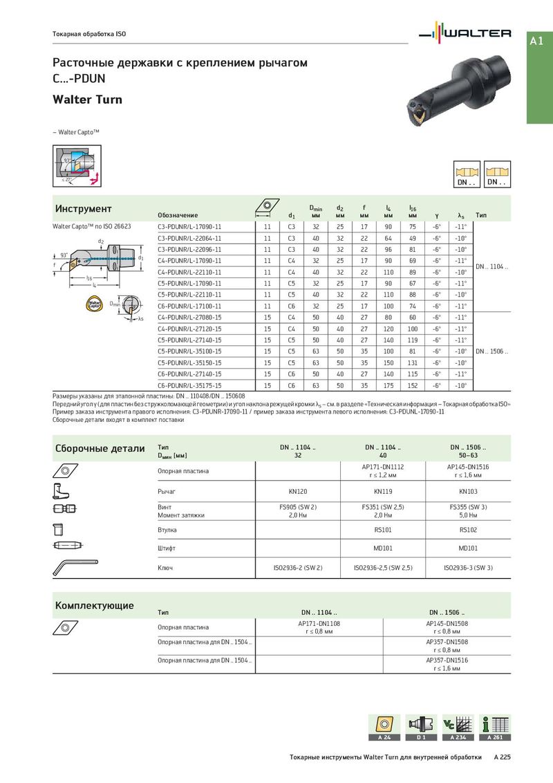 Токарная обработка ISO A1 Расточные державки с креплением рычагом C...-PDUN Walter Turn – Walter Capto™ 93° ≤ 27° DN . . DN . . Инструмент Dmin d2 f l4 l16 Обозначение d1 мм мм мм мм мм γ λs Тип Walter Capto™ по ISO 26623 C3-PDUNR/L-17090-11 11 C3 32 25 17 90 75 -6° -11° d2 C3-PDUNR/L-22064-11 11 C3 40 32 22 64 49 -6° -10° C3-PDUNR/L-22096-11 11 C3 40 32 22 96 81 -6° -10° 93˚ d1 f C4-PDUNR/L-17090-11 11 C4 32 25 17 90 69 -6° -11° DN .. 1104 .. l16 C4-PDUNR/L-22110-11 11 C4 40 32 22 110 89 -6° -10° l4 C5-PDUNR/L-17090-11 11 C5 32 25 17 90 67 -6° -11° C5-PDUNR/L-22110-11 11 C5 40 32 22 110 88 -6° -10° Dmin C6-PDUNR/L-17100-11 11 C6 32 25 17 100 74 -6° -11° λs C4-PDUNR/L-27080-15 15 C4 50 40 27 80 60 -6° -11° C4-PDUNR/L-27120-15 15 C4 50 40 27 120 100 -6° -11° C5-PDUNR/L-27140-15 15 C5 50 40 27 140 119 -6° -11° C5-PDUNR/L-35100-15 15 C5 63 50 35 100 81 -6° -10° DN .. 1506 .. C5-PDUNR/L-35150-15 15 C5 63 50 35 150 131 -6° -10° C6-PDUNR/L-27140-15 15 C6 50 40 27 140 115 -6° -11° C6-PDUNR/L-35175-15 15 C6 63 50 35 175 152 -6° -10° Размеры указаны для эталонной пластины: DN .. 110408/DN .. 150608 Передний угол γ (для пластин без стружколомающей геометрии) и угол наклона режущей кромки λs − см. в разделе «Техническая информация – Токарная обработка ISO» Пример заказа инструмента правого исполнения: C3-PDUNR-17090-11 / пример заказа инструмента левого исполнения: C3-PDUNL-17090-11 Сборочные детали входят в комплект поставки Сборочные детали Тип DN .. 1104 .. DN .. 1104 .. DN .. 1506 .. Dмин [мм] 32 40 50–63 Опорная пластина AP171-DN1112 AP145-DN1516 r ≤ 1,2 мм r ≤ 1,6 мм Рычаг KN120 KN119 KN103 Винт FS905 (SW 2) FS351 (SW 2,5) FS355 (SW 3) Момент затяжки 2,0 Нм 2,0 Нм 5,0 Нм Втулка RS101 RS102 Штифт MD101 MD101 Ключ ISO2936-2 (SW 2) ISO2936-2,5 (SW 2,5) ISO2936-3 (SW 3) Комплектующие Тип DN .. 1104 .. DN .. 1506 .. Опорная пластина AP171-DN1108 AP145-DN1508 r ≤ 0,8 мм r ≤ 0,8 мм Опорная пластина для DN .. 1504 .. AP357-DN1508 r ≤ 0,8 мм Опорная пластина для DN .. 1504 .. AP357-DN1516 r ≤ 1,6 мм A 24 D1 A 234 A 261 Токарные инструменты Walter Turn для внутренней обработки A 225