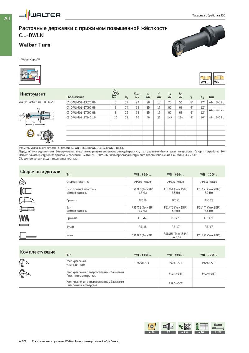 A1 Токарная обработка ISO Расточные державки с прижимом повышенной жёсткости C...-DWLN Walter Turn – Walter Capto™ 95° WN . . WN . . Инструмент Dmin d2 f l4 l16 Обозначение d1 мм мм мм мм мм γ λs Тип Walter Capto™ по ISO 26623 C4-DWLNR/L-13075-06 6 C4 27 20 13 75 52 -6° -17° WN .. 0604 .. d2 C4-DWLNR/L-17090-08 8 C4 33 25 17 90 68 -6° -12° WN .. 0804 .. 95˚ C5-DWLNR/L-17090-08 8 C5 33 25 17 90 66 -6° -12° f d1 C6-DWLNR/L-27140-10 10 C6 50 40 27 140 114 -6° -16° WN .. 1006 .. l16 l4 Dmin λs Размеры указаны для эталонной пластины: WN .. 060408/WN .. 080408/WN .. 100612 Передний угол γ (для пластин без стружколомающей геометрии) и угол наклона режущей кромки λs − см. в разделе «Техническая информация – Токарная обработка ISO» Пример заказа инструмента правого исполнения: C4-DWLNR-13075-06 / пример заказа инструмента левого исполнения: C4-DWLNL-13075-06 Сборочные детали входят в комплект поставки Сборочные детали Тип WN .. 0604 .. WN .. 0804 .. WN .. 1006 .. Опорная пластина AP306-WN06 AP331-WN08 AP311-WN10 Винт опорной пластины FS1462 (Torx 9IP) FS1461 (Torx 15IP) FS1463 (Torx 20IP) Момент затяжки 1,5 Нм 2,5 Нм 5,0 Нм Прижим PK240 PK241 PK242 Винт FS1472 (Torx 9IP) FS1473 (Torx 15IP) FS1474 (Torx 20IP) Момент затяжки 1,7 Нм 3,9 Нм 6,4 Нм Пружина FS1469 FS1470 FS1471 Штифт RS116 RS117 RS117 Ключ FS1466 (Torx 9IP) FS1465 (Torx 15IP / FS1464 (Torx 20IP) SW 3,5) Комплектующие Тип WN .. 0604 .. WN .. 0804 .. WN .. 1006 .. Узел крепления PK240-SET PK241-SET PK242-SET (стандартный) Узел крепления с твердосплавным башмаком PK245-SET PK246-SET Пластины с отверстием Узел крепления с твердосплавным башмаком PK254-SET Пластины без отверстия A 34 D1 A 234 A 261 A 262 A 228 Токарные инструменты Walter Turn для внутренней обработки