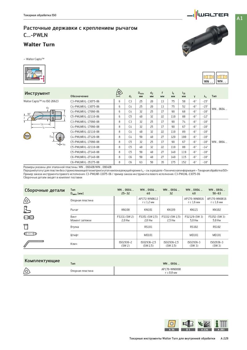Токарная обработка ISO A1 Расточные державки с креплением рычагом C...-PWLN Walter Turn – Walter Capto™ 95° WN . . WN . . Инструмент Dmin d2 f l4 l16 Обозначение d1 мм мм мм мм мм γ λs Тип Walter Capto™ по ISO 26623 C3-PWLNR/L-13075-06 6 C3 25 20 13 75 58 -6° -15° d2 C4-PWLNR/L-13075-06 6 C4 25 20 13 75 52 -6° -15° WN .. 0604 .. C4-PWLNR/L-17090-06 6 C4 32 25 17 90 68 -6° -10° 95˚ d1 C5-PWLNR/L-22110-06 6 C5 40 32 22 110 88 -6° -12° f l16 C3-PWLNR/L-17090-08 8 C3 32 25 17 90 74 -6° -10° l4 C4-PWLNR/L-17090-08 8 C4 32 25 17 90 67 -6° -10° C4-PWLNR/L-22110-08 8 C4 40 32 22 110 89 -6° -10° Dmin C4-PWLNR/L-27120-08 8 C4 50 40 27 120 100 -6° -10° C5-PWLNR/L-17090-08 8 C5 32 25 17 90 67 -6° -10° WN .. 0804 .. λs C5-PWLNR/L-22110-08 8 C5 40 32 22 110 88 -6° -14° C5-PWLNR/L-27140-08 8 C5 50 40 27 140 119 -6° -10° C6-PWLNR/L-27140-08 8 C6 50 40 27 140 115 -6° -10° C6-PWLNR/L-35175-08 8 C6 63 50 35 175 152 -6° -10° Размеры указаны для эталонной пластины: WN .. 060408/WN .. 080408 Передний угол γ (для пластин без стружколомающей геометрии) и угол наклона режущей кромки λs − см. в разделе «Техническая информация – Токарная обработка ISO» Пример заказа инструмента правого исполнения: C3-PWLNR-13075-06 / пример заказа инструмента левого исполнения: C3-PWLNL-13075-06 Сборочные детали входят в комплект поставки Сборочные детали Тип WN .. 0604 .. WN .. 0604 .. WN .. 0804 .. WN .. 0804 .. WN .. 0804 .. Dмин [мм] 25–32 40 32 40 50–63 Опорная пластина AP172-WN0612 AP170-WN0816 AP170-WN0816 r ≤ 1,2 мм r ≤ 1,6 мм r ≤ 1,6 мм Рычаг KN108 KN101 KN109 KN121 KN102 Винт FS331 (SW 2) FS351 (SW 2,5) FS332 (SW 2,5) FS2129 (SW 3) FS352 (SW 3) Момент затяжки 2,0 Нм 2,0 Нм 2,5 Нм 5,0 Нм 5,0 Нм Втулка RS101 RS102 RS102 Штифт MD101 MD101 MD101 Ключ ISO2936-2 ISO2936-2,5 ISO2936-2,5 ISO2936-3 ISO2936-3 (SW 2) (SW 2,5) (SW 2,5) (SW 3) (SW 3) Комплектующие Тип WN .. 0804 .. Опорная пластина AP170-WN0808 r ≤ 0,8 мм A 34 D1 A 234 A 261 Токарные инструменты Walter Turn для внутренней обработки A 229