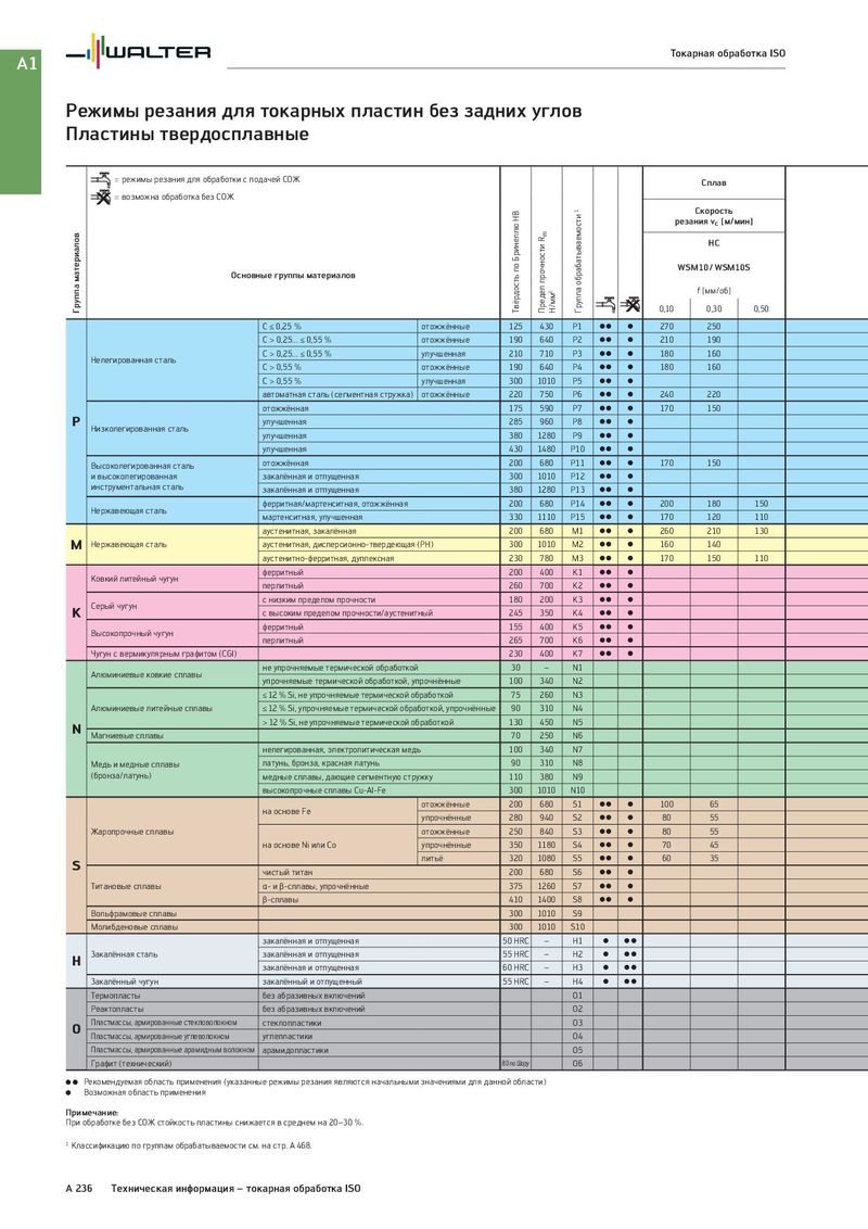 A1 Токарная обработка ISO Режимы резания для токарных пластин без задних углов Пластины твердосплавные = режимы резания для обработки с подачей СОЖ Сплав = возможна обработка без СОЖ Твёрдость по Бринеллю HB Группа обрабатываемости 1 Скорость резания vc [м/мин] Группа материалов Предел прочности Rm HC WSM10 / WSM10S Основные группы материалов Н/мм2 f [мм/об] 0,10 0,30 0,50 C ≤ 0,25 % отожжённые 125 430 P1 CC C 270 250 C > 0,25... ≤ 0,55 % отожжённые 190 640 P2 CC C 210 190 Нелегированная сталь C > 0,25... ≤ 0,55 % улучшенная 210 710 P3 CC C 180 160 C > 0,55 % отожжённые 190 640 P4 CC C 180 160 C > 0,55 % улучшенная 300 1010 P5 CC C автоматная сталь (сегментная стружка) отожжённые 220 750 P6 CC C 240 220 отожжённая 175 590 P7 CC C 170 150 P Низколегированная сталь улучшенная 285 960 P8 CC C улучшенная 380 1280 P9 CC C улучшенная 430 1480 P10 CC C Высоколегированная сталь отожжённая 200 680 P11 CC C 170 150 и высоколегированная закалённая и отпущенная 300 1010 P12 CC C инструментальная сталь закалённая и отпущенная 380 1280 P13 CC C Нержавеющая сталь ферритная/мартенситная, отожжённая 200 680 P14 CC C 200 180 150 мартенситная, улучшенная 330 1110 P15 CC C 170 120 110 аустенитная, закалённая 200 680 M1 CC C 260 210 130 M Нержавеющая сталь аустенитная, дисперсионно-твердеющая (PH) 300 1010 M2 CC C 160 140 аустенитно-ферритная, дуплексная 230 780 M3 CC C 170 150 110 Ковкий литейный чугун ферритный 200 400 K1 CC C перлитный 260 700 K2 CC C Серый чугун с низким пределом прочности 180 200 K3 CC C K с высоким пределом прочности/аустенитный 245 350 K4 CC C Высокопрочный чугун ферритный 155 400 K5 CC C перлитный 265 700 K6 CC C Чугун с вермикулярным графитом (CGI) 230 400 K7 CC C Алюминиевые ковкие сплавы не упрочняемые термической обработкой 30 – N1 упрочняемые термической обработкой, упрочнённые 100 340 N2 ≤ 12 % Si, не упрочняемые термической обработкой 75 260 N3 Алюминиевые литейные сплавы ≤ 12 % Si, упрочняемые термической обработкой, упрочнённые 90 310 N4 N > 12 % Si, не упрочняемые термической обработкой 130 450 N5 Магниевые сплавы 70 250 N6 нелегированная, электролитическая медь 100 340 N7 Медь и медные сплавы латунь, бронза, красная латунь 90 310 N8 (бронза/латунь) медные сплавы, дающие сегментную стружку 110 380 N9 высокопрочные сплавы Cu-Al-Fe 300 1010 N10 на основе Fe отожжённые 200 680 S1 CC C 100 65 упрочнённые 280 940 S2 CC C 80 55 Жаропрочные сплавы отожжённые 250 840 S3 CC C 80 55 на основе Ni или Co упрочнённые 350 1180 S4 CC C 70 45 S литьё 320 1080 S5 CC C 60 35 чистый титан 200 680 S6 CC C Титановые сплавы α- и β-сплавы, упрочнённые 375 1260 S7 CC C β-сплавы 410 1400 S8 CC C Вольфрамовые сплавы 300 1010 S9 Молибденовые сплавы 300 1010 S10 закалённая и отпущенная 50 HRC – H1 C CC H Закалённая сталь закалённая и отпущенная 55 HRC – H2 C CC закалённая и отпущенная 60 HRC – H3 C CC Закалённый чугун закалённый и отпущенный 55 HRC – H4 C CC Термопласты без абразивных включений O1 Реактопласты без абразивных включений O2 O Пластмассы, армированные стекловолокном стеклопластики O3 Пластмассы, армированные углеволокном углепластики O4 Пластмассы, армированные арамидным волокном арамидопластики O5 Графит (технический) 80 по Шору O6 CC Рекомендуемая область применения (указанные режимы резания являются начальными значениями для данной области) C Возможная область применения Примечание: При обработке без СОЖ стойкость пластины снижается в среднем на 20–30 %. 1 Классификацию по группам обрабатываемости см. на стр. A 468. A 236 Техническая информация – токарная обработка ISO