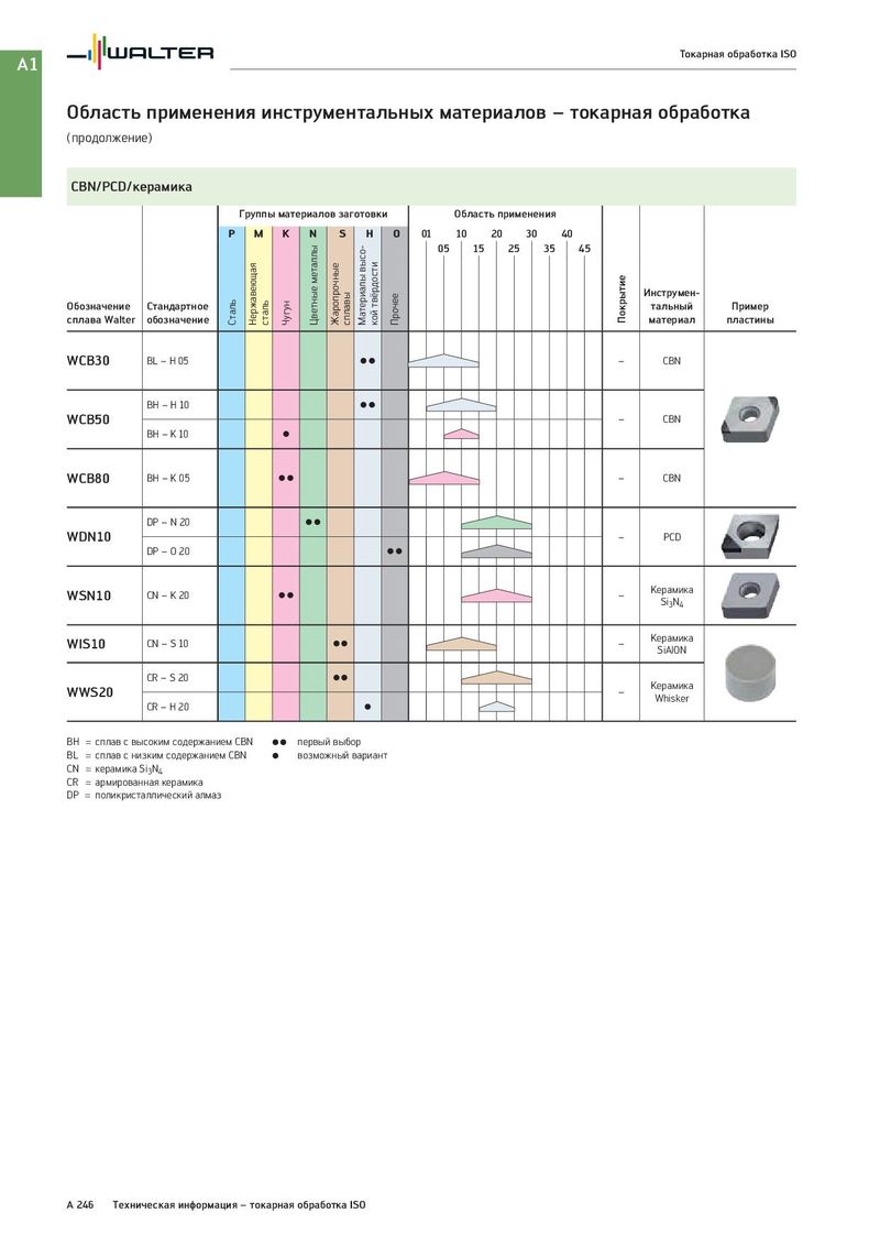 A1 Токарная обработка ISO Область применения инструментальных материалов – токарная обработка (продолжение) CBN/PCD/керамика Группы материалов заготовки Область применения P M K N S H O 01 10 20 30 40 Цветные металлы Материалы высо- 05 15 25 35 45 Нержавеющая Жаропрочные сплавы кой твёрдости Прочее Покрытие Инструмен- Обозначение Стандартное Сталь сталь Чугун тальный Пример сплава Walter обозначение материал пластины WCB30 BL – H 05 CC – CBN BH – H 10 CC WCB50 – CBN BH – K 10 C WCB80 BH – K 05 CC – CBN DP – N 20 CC WDN10 – PCD DP – O 20 CC WSN10 CN – K 20 CC – Керамика Si3N4 WIS10 CN – S 10 CC – Керамика SiAlON CR – S 20 CC Керамика WWS20 – Whisker CR – H 20 C BH = сплав с высоким содержанием CBN CC первый выбор BL = сплав с низким содержанием CBN C возможный вариант CN = керамика Si3N4 CR = армированная керамика DP = поликристаллический алмаз A 246 Техническая информация – токарная обработка ISO