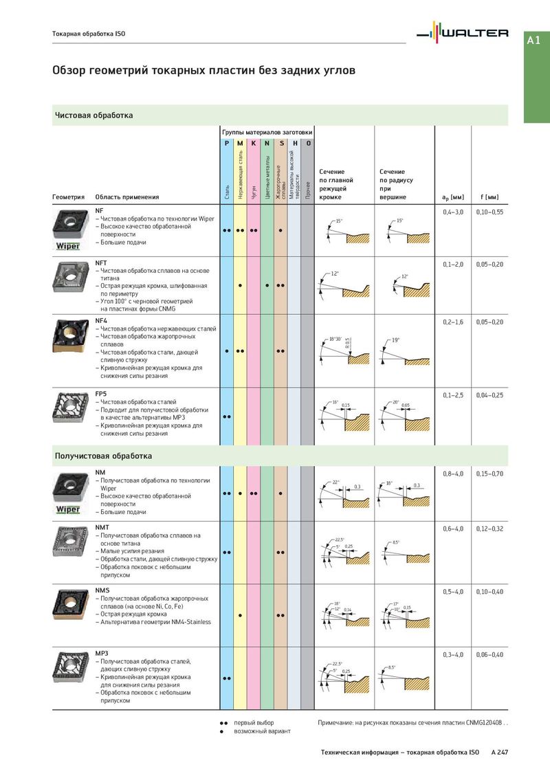 Токарная обработка ISO A1 Обзор геометрий токарных пластин без задних углов Чистовая обработка Группы материалов заготовки P M K N S H O Нержавеющая сталь Цветные металлы Жаропрочные Материалы высокой твёрдости Сечение Сечение сплавы Прочее по главной по радиусу Сталь Чугун режущей при Геометрия Область применения кромке вершине ap [мм] f [мм] NF 0,4–3,0 0,10–0,55 – Чистовая обработка по технологии Wiper 15° 15° – Высокое качество обработанной CC CC CC C поверхности – Большие подачи NFT 0,1–2,0 0,05–0,20 – Чистовая обработка сплавов на основе 12° титана 12° – Острая режущая кромка, шлифованная C C CC по периметру – Угол 100° с черновой геометрией на пластинах формы CNMG NF4 0,2–1,6 0,05–0,20 – Чистовая обработка нержавеющих сталей – Чистовая обработка жаропрочных 18°30' R 0,5 19° сплавов – Чистовая обработка стали, дающей C CC CC сливную стружку – Криволинейная режущая кромка для снижения силы резания FP5 0,1–2,5 0,04–0,25 – Чистовая обработка сталей 16° 0,15 20° 0,05 – Подходит для получистовой обработки в качестве альтернативы MP3 CC – Криволинейная режущая кромка для снижения силы резания Получистовая обработка NM 0,8–4,0 0,15–0,70 – Получистовая обработка по технологии 22° 18° 0,3 Wiper 0,3 – Высокое качество обработанной CC C CC C поверхности – Большие подачи NMT 0,6–4,0 0,12–0,32 – Получистовая обработка сплавов на 22,5° основе титана 0,25 8,5° – Малые усилия резания 5° CC CC – Обработка стали, дающей сливную стружку – Обработка поковок с небольшим припуском NMS 0,5–4,0 0,10–0,40 – Получистовая обработка жаропрочных сплавов (на основе Ni, Co, Fe) 18° 17° 0,15 12° 0,14 10° – Острая режущая кромка C CC – Альтернатива геометрии NM4-Stainless MP3 0,3–4,0 0,06–0,40 – Получистовая обработка сталей, 22,5° дающих сливную стружку 5° 0,25 8,5° – Криволинейная режущая кромка CC для снижения силы резания – Обработка поковок с небольшим припуском CC первый выбор Примечание: на рисунках показаны сечения пластин CNMG120408 . . C возможный вариант Техническая информация – токарная обработка ISO A 247