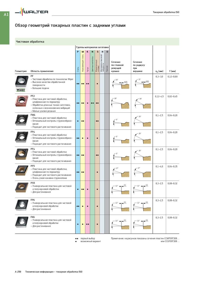 A1 Токарная обработка ISO Обзор геометрий токарных пластин с задними углами Чистовая обработка Группы материалов заготовки P M K N S H O Нержавеющая сталь Цветные металлы Жаропрочные Материалы высокой твёрдости Сечение Сечение сплавы Прочее по главной по радиусу Сталь Чугун режущей при Геометрия Область применения кромке вершине ap [мм] f [мм] PF 0,3–3,0 0,12–0,60 – Чистовая обработка по технологии Wiper 15° 15° – Высокое качество обработанной 0,05 0,05 поверхности CC CC CC C – Большие подачи PF2 0,12–4,5 0,02–0,45 – Пластина для чистовой обработки, 18° 18° шлифованная по периметру CC CC C CC CC – Обработка длинных тонких заготовок, склонных к возникновению вибраций – Малые усилия резания FM4 20° 0,1–2,5 0,04–0,20 – Пластина для чистовой обработки 6° – Оптимальный контроль стружкообразо- C CC CC вания – Подходит для чистового растачивания FP4 20° 0,1–2,5 0,04–0,20 – Пластина для чистовой обработки 6° – Оптимальный контроль стружкообразо- CC C C C вания – Подходит для чистового растачивания PF4 20° 0,1–2,5 0,04–0,20 – Пластина для чистовой обработки 6° – Оптимальный контроль стружкообразо- CC CC CC вания – Подходит для чистового растачивания PF5 0,1–4,0 0,04–0,35 – Пластина для чистовой обработки, 17° 17° шлифованная по периметру CC CC C – Подходит для чистового растачивания – Очень узкая канавка стружколома PS5 0,3–2,5 0,08–0,32 – Универсальная пластина для чистовой 12° 0,1 12° 0,1 и получерновой обработки C CC C C – Для растачивания FP6 0,3–2,5 0,08–0,32 – Универсальная пластина для чистовой 12° 0,1 12° 0,1 и получерновой обработки CC C C C – Для растачивания FK6 0,3–2,5 0,08–0,32 – Универсальная пластина для чистовой 12° 0,1 12° 0,1 и получерновой обработки C C CC C – Для растачивания CC первый выбор Примечание: на рисунках показаны сечения пластин CCMT09T308 . . C возможный вариант или CCGT09T308 . . A 250 Техническая информация – токарная обработка ISO