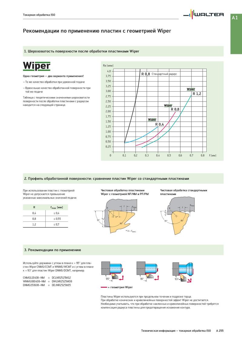 Токарная обработка ISO A1 Рекомендации по применению пластин с геометрией Wiper 1. Шероховатость поверхности после обработки пластинами Wiper Ra [мкм] 4,0 Одна геометрия – два варианта применения! 3,75 R 0,8 Стандартный радиус – То же качество обработки при удвоенной подаче 3,50 – Вдвое выше качество обработанной поверхности при 3,25 той же подаче 3,00 R 1,2 Таблица с теоретическими значениями шероховатости 2,75 поверхности после обработки пластинами с радиусом 2,50 находится на следующей странице. 2,25 2,00 R 0,8 1,75 1,50 1,25 R 0,4 1,00 0,75 0,50 0,25 0 0,1 0,2 0,3 0,4 0,5 0,6 0,7 0,8 f [мм] 2. Профиль обработанной поверхности: сравнение пластин Wiper со стандартными пластинами При использовании пластин с геометрией Чистовая обработка пластинами Чистовая обработка стандартными Wiper не допускается превышение Wiper с геометрией NF/NM и PF/PM пластинами указанных максимальных значений подачи: R fmax [мм] f Rmax Rmax R 2 R f 0,4 ≤ 0,4 ap 0,8 ≤ 0,55 ap b* 95° 95° 80° 1,2 ≤ 0,7 80° * b = fмакс. 3. Рекомендации по применению Используйте державки с углом в плане κ = 95° для пла- стин Wiper CNMG/CCMT и WNMG/WCMT и с углом в плане κ = 93° для пластин Wiper DNMG/DCMT, например: CNMG120408–NM ‡ DCLNR2525M12 95° 95° 93° WNMG080408–NM ‡ DWLNR2525MO8 DNMG150608–NM ‡ DDJNR2525M15 = геометрия Wiper Пластины Wiper используются при продольном точении и подрезке торца. При обработке конических и криволинейных поверхностей эффект Wiper не достигается. Необходимо учитывать, что при обработке наклонных и криволинейных поверхностей требуется компенсация радиуса пластины для предотвращения искажения контура. Техническая информация – токарная обработка ISO A 255