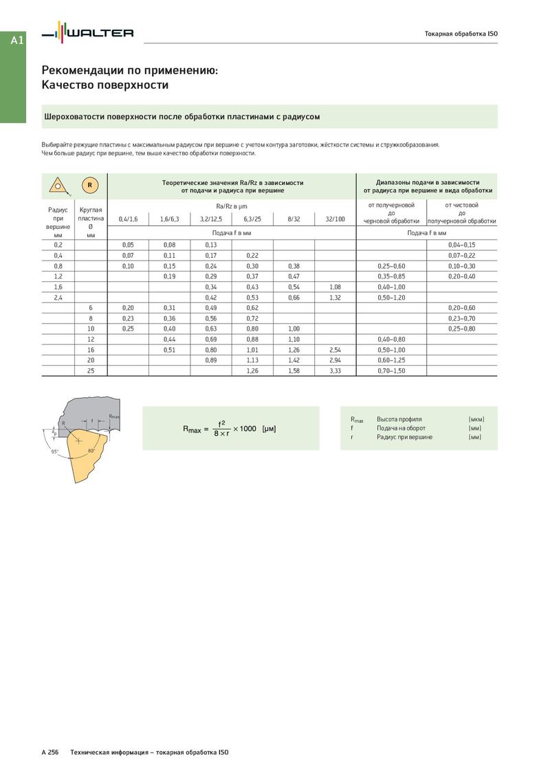 A1 Токарная обработка ISO Рекомендации по применению: Качество поверхности Шероховатости поверхности после обработки пластинами с радиусом Выбирайте режущие пластины с максимальным радиусом при вершине с учетом контура заготовки, жёсткости системы и стружкообразования. Чем больше радиус при вершине, тем выше качество обработки поверхности. R Теоретические значения Ra/Rz в зависимости Диапазоны подачи в зависимости от подачи и радиуса при вершине от радиуса при вершине и вида обработки r Радиус Круглая Ra/Rz в μm от получерновой от чистовой при пластина до до 0,4/1,6 1,6/6,3 3,2/12,5 6,3/25 8/32 32/100 черновой обработки получерновой обработки вершине Ø мм мм Подача f в мм Подача f в мм 0,2 0,05 0,08 0,13 0,04–0,15 0,4 0,07 0,11 0,17 0,22 0,07–0,22 0,8 0,10 0,15 0,24 0,30 0,38 0,25–0,60 0,10–0,30 1,2 0,19 0,29 0,37 0,47 0,35–0,85 0,20–0,40 1,6 0,34 0,43 0,54 1,08 0,40–1,00 2,4 0,42 0,53 0,66 1,32 0,50–1,20 6 0,20 0,31 0,49 0,62 0,20–0,60 8 0,23 0,36 0,56 0,72 0,23–0,70 10 0,25 0,40 0,63 0,80 1,00 0,25–0,80 12 0,44 0,69 0,88 1,10 0,40–0,80 16 0,51 0,80 1,01 1,26 2,54 0,50–1,00 20 0,89 1,13 1,42 2,94 0,60–1,25 25 1,26 1,58 3,33 0,70–1,50 Rmax Rmax Высота профиля [мкм] R f ap f Подача на оборот [мм] r Радиус при вершине [мм] 95° 80° A 256 Техническая информация – токарная обработка ISO