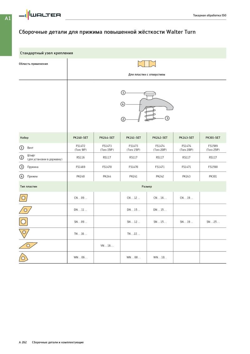 A1 Токарная обработка ISO Сборочные детали для прижима повышенной жёсткости Walter Turn Стандартный узел крепления Область применения Для пластин с отверстием x { y z Набор PK240-SET PK244-SET PK241-SET PK242-SET PK243-SET PK301-SET x Винт FS1472 FS1473 FS1473 FS1474 FS1474 FS1589 (Torx 9IP) (Torx 15IP) (Torx 15IP) (Torx 20IP) (Torx 20IP) (Torx 25IP) y Штифт RS116 RS117 RS117 RS117 RS117 RS117 (для установки в державку) z Пружина FS1469 FS1470 FS1470 FS1471 FS1471 FS1590 { Прижим PK240 PK244 PK241 PK242 PK243 PK301 Тип пластин Размер CN . . 09 . . CN . . 12 . . CN . . 16 . . CN . . 19 . . DN . . 11 . . DN . . 15 . . DN . . 15 . . SN . . 09 . . SN . . 12 . . SN . . 15 . . SN . . 19 . . SN . . 25 . . TN . . 16 . . TN . . 22 . . VN . . 16 . . WN . . 06 . . WN . . 08 . . WN . . 10. . A 262 Сборочные детали и комплектующие