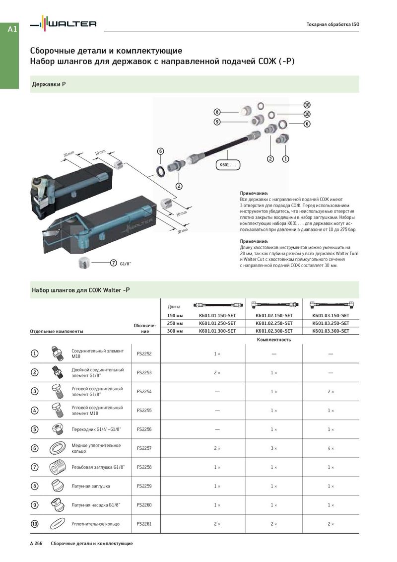 A1 Токарная обработка ISO Сборочные детали и комплектующие Набор шлангов для державок с направленной подачей СОЖ (-P) Державки P 30 mm 10 mm K601 . . . Примечание: Все державки с направленной подачей СОЖ имеют 3 отверстия для подвода СОЖ. Перед использованием 10 mm инструментов убедитесь, что неиспользуемые отверстия плотно закрыты входящими в набор заглушками. Наборы комплектующих набора K601 . . . для державок могут ис- 30 mm пользоваться при давлении в диапазоне от 10 до 275 бар. Примечание: Длину хвостовиков инструментов можно уменьшить на 20 мм, так как глубина резьбы у всех державок Walter Turn и Walter Cut с хвостовиком прямоугольного сечения G1/8" с направленной подачей СОЖ составляет 30 мм. Набор шлангов для СОЖ Walter -P Длина 150 мм K601.01.150-SET K601.02.150-SET K601.03.150-SET Обозначе- 250 мм K601.01.250-SET K601.02.250-SET K601.03.250-SET Отдельные компоненты ние 300 мм K601.01.300-SET K601.02.300-SET K601.03.300-SET Комплектность x Соединительный элемент FS2252 1× — — M10 y Двойной соединительный FS2253 2× 1× — элемент G1/8" z Угловой соединительный FS2254 — 1× 2× элемент G1/8" { Угловой соединительный FS2255 — 1× 1× элемент M10 | Переходник G1/4"–G1/8" FS2256 — 1× 1× } Медное уплотнительное FS2257 2× 3× 4× кольцо ~ Резьбовая заглушка G1/8" FS2258 1× 1× 1× Латунная заглушка FS2259 1× 1× 1× Латунная насадка G1/8" FS2260 1× 1× 1× Уплотнительное кольцо FS2261 2× 2× 2× A 266 Сборочные детали и комплектующие