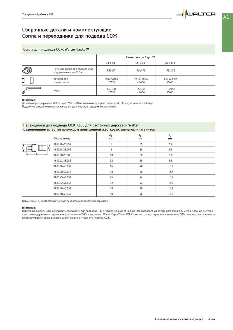 Токарная обработка ISO A1 Сборочные детали и комплектующие Сопла и переходники для подвода СОЖ Сопла для подвода СОЖ Walter Capto™ Размер Walter Capto™ C3 + C4 C5 + C6 C6 + C 8 Латунное сопло для подвода СОЖ FS1477 FS1476 FS1479 под давлением до 80 бар Вставки для FS1477HEX FS1476HEX FS1479HEX смены сопла (SW5) (SW5) (SW5) Ключ FS2158 FS2158 FS2158 (SW5) (SW5) (SW5) Внимание: Для некоторых державок Walter Capto™ (C3–C8) используются другие сопла для СОЖ, не указанные в таблице. Подробное описание находится на страницах с соответствующим инструментом. Переходники для подвода СОЖ K600 для расточных державок Walter с креплением пластин прижимом повышенной жёсткости, рычагом или винтом d1 l1 d2 Обозначение мм мм мм K600.06.25.054 6 25 5,4 d1 d2 K600.08.28.066 8 28 6,6 l1 K600.10.28.086 10 28 8,6 K600.12.38.086 12 38 8,6 K600.16.40.137 16 40 13,7 K600.20.40.137 20 40 13,7 K600.25.44.137 25 44 13,7 K600.32.44.137 32 44 13,7 K600.40.46.137 40 46 13,7 K600.50.46.137 50 46 13,7 Примечание: d1 соответствует диаметру хвостовика расточной державки Внимание: При необходимости можно укоротить переходник для подвода СОЖ, отступив на 3 мм от кольца. Это позволяет укоротить крепление при использовании системы «расточная державка + переходник для подвода СОЖ» в державках Walter Capto™ или VDI. Кроме того, предотвращается вытекание СОЖ по поверхности контакта и обеспечивается более высокое давление для внутреннего подвода СОЖ. Сборочные детали и комплектующие A 267