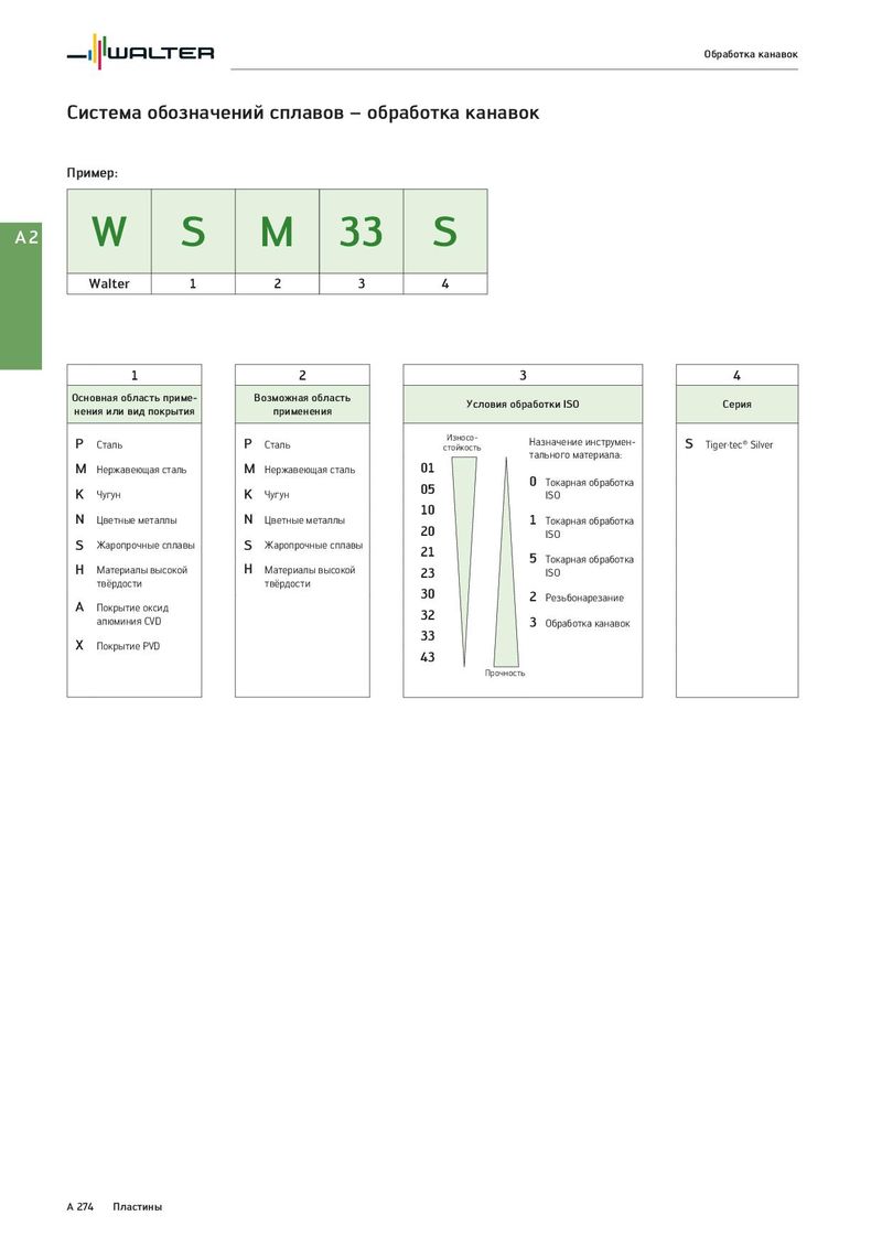 Обработка канавок Система обозначений сплавов – обработка канавок Пример: A2 W S M 33 S Walter 1 2 3 4 1 2 3 4 Основная область приме- Возможная область Условия обработки ISO Серия нения или вид покрытия применения P Сталь P Сталь Износо- Назначение инструмен- S Tiger·tec® Silver стойкость тального материала: M Нержавеющая сталь M Нержавеющая сталь 01 05 0 Токарная обработка K Чугун K Чугун ISO N N 10 1 Цветные металлы Цветные металлы Токарная обработка 20 ISO S Жаропрочные сплавы S Жаропрочные сплавы 21 H 5 Токарная обработка H Материалы высокой Материалы высокой 23 ISO твёрдости твёрдости 30 2 Резьбонарезание A Покрытие оксид 32 алюминия CVD 3 Обработка канавок X 33 Покрытие PVD 43 Прочность A 274 Пластины