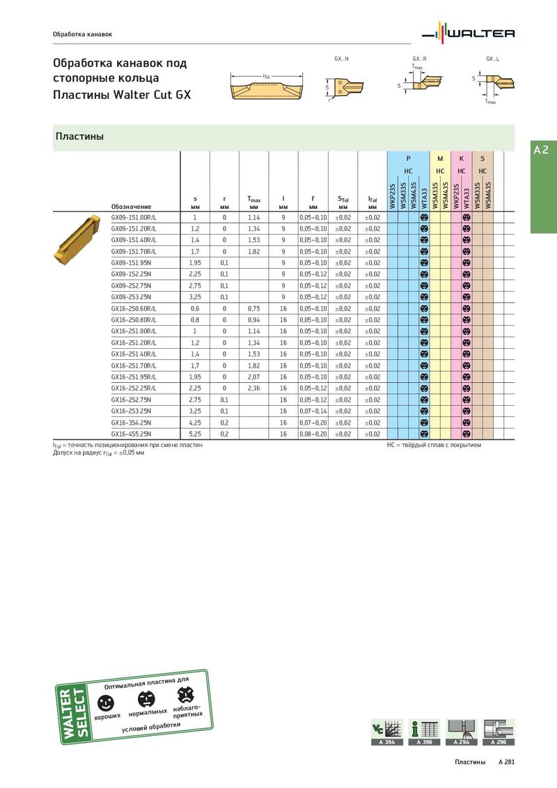 Обработка канавок Обработка канавок под GX...N GX...R GX...L Tmax стопорные кольца lTol. S S S Пластины Walter Cut GX r Tmax Пластины A2 P M K S HC HC HC HC s r Tmax l f STol lTol WKP23S WSM33S WSM43S WTA33 WSM33S WSM43S WKP23S WTA33 WSM33S WSM43S Обозначение мм мм мм мм мм мм мм GX09-1S1.00R/L 1 0 1,14 9 0,05–0,10 ±0,02 ±0,02 b b GX09-1S1.20R/L 1,2 0 1,34 9 0,05–0,10 ±0,02 ±0,02 b b GX09-1S1.40R/L 1,4 0 1,53 9 0,05–0,10 ±0,02 ±0,02 b b GX09-1S1.70R/L 1,7 0 1,82 9 0,05–0,10 ±0,02 ±0,02 b b GX09-1S1.95N 1,95 0,1 9 0,05–0,10 ±0,02 ±0,02 b b GX09-1S2.25N 2,25 0,1 9 0,05–0,12 ±0,02 ±0,02 b b GX09-2S2.75N 2,75 0,1 9 0,05–0,12 ±0,02 ±0,02 b b GX09-2S3.25N 3,25 0,1 9 0,05–0,12 ±0,02 ±0,02 b b GX16-2S0.60R/L 0,6 0 0,75 16 0,05–0,10 ±0,02 ±0,02 b b GX16-2S0.80R/L 0,8 0 0,94 16 0,05–0,10 ±0,02 ±0,02 b b GX16-2S1.00R/L 1 0 1,14 16 0,05–0,10 ±0,02 ±0,02 b b GX16-2S1.20R/L 1,2 0 1,34 16 0,05–0,10 ±0,02 ±0,02 b b GX16-2S1.40R/L 1,4 0 1,53 16 0,05–0,10 ±0,02 ±0,02 b b GX16-2S1.70R/L 1,7 0 1,82 16 0,05–0,10 ±0,02 ±0,02 b b GX16-2S1.95R/L 1,95 0 2,07 16 0,05–0,10 ±0,02 ±0,02 b b GX16-2S2.25R/L 2,25 0 2,36 16 0,05–0,12 ±0,02 ±0,02 b b GX16-2S2.75N 2,75 0,1 16 0,05–0,12 ±0,02 ±0,02 b b GX16-2S3.25N 3,25 0,1 16 0,07–0,14 ±0,02 ±0,02 b b GX16-3S4.25N 4,25 0,2 16 0,07–0,20 ±0,02 ±0,02 b b GX16-4S5.25N 5,25 0,2 16 0,08–0,20 ±0,02 ±0,02 b b lTol = точность позиционирования при смене пластин HC = твёрдый сплав с покрытием Допуск на радиус rTol = ±0,05 мм Оптимальная пластина для хороших нормальных пнреиблятангыо-х условий обработки A 394 A 396 A 294 A 296 Пластины A 281