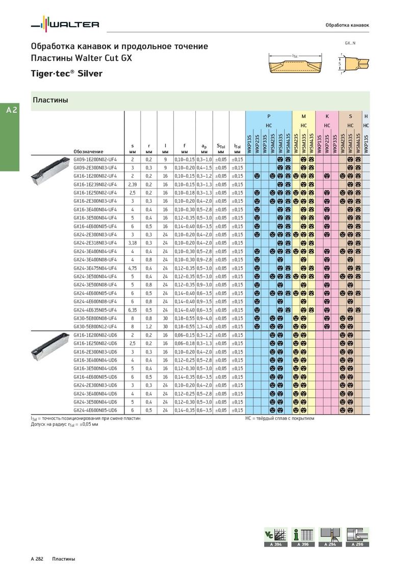 Обработка канавок Обработка канавок и продольное точение GX...N Пластины Walter Cut GX lTol. r S Tiger·tec® Silver r Пластины A2 P M K S H HC HC HC HC HC s r l f ap STol lTol WKP13S WKP23S WKP33S WSM23S WSM33S WSM43S WSM23S WSM33S WSM43S WKP13S WKP23S WKP33S WSM23S WSM33S WSM43S WKP13S Обозначение мм мм мм мм мм мм мм GX09-1E200N02-UF4 2 0,2 9 0,10–0,15 0,3–1,0 ±0,05 ±0,15 bc bc b c GX09-2E300N03-UF4 3 0,3 9 0,10–0,20 0,4–1,5 ±0,05 ±0,15 bc bc b c GX16-1E200N02-UF4 2 0,2 16 0,10–0,15 0,3–1,2 ±0,05 ±0,15 a abcabc b a b c GX16-1E239N02-UF4 2,39 0,2 16 0,10–0,15 0,3–1,3 ±0,05 ±0,15 bc bc b c GX16-1E250N02-UF4 2,5 0,2 16 0,10–0,18 0,3–1,3 ±0,05 ±0,15 a abcabc b a b c GX16-2E300N03-UF4 3 0,3 16 0,10–0,20 0,4–2,0 ±0,05 ±0,15 a abcabc b a b c GX16-3E400N04-UF4 4 0,4 16 0,10–0,30 0,5–2,8 ±0,05 ±0,15 a bc bc b b c GX16-3E500N04-UF4 5 0,4 16 0,12–0,35 0,5–3,0 ±0,05 ±0,15 a bc bc b b c GX16-4E600N05-UF4 6 0,5 16 0,14–0,40 0,6–3,5 ±0,05 ±0,15 a bc bc b b c GX24-2E300N03-UF4 3 0,3 24 0,10–0,20 0,4–2,0 ±0,05 ±0,15 a abcabc b a b c GX24-2E318N03-UF4 3,18 0,3 24 0,10–0,20 0,4–2,0 ±0,05 ±0,15 bc bc b c GX24-3E400N04-UF4 4 0,4 24 0,10–0,30 0,5–2,8 ±0,05 ±0,15 a abcabc b a b c GX24-3E400N08-UF4 4 0,8 24 0,10–0,30 0,9–2,8 ±0,05 ±0,15 a b b b b GX24-3E475N04-UF4 4,75 0,4 24 0,12–0,35 0,5–3,0 ±0,05 ±0,15 a bc bc b b c GX24-3E500N04-UF4 5 0,4 24 0,12–0,35 0,5–3,0 ±0,05 ±0,15 a abcabc b a b c GX24-3E500N08-UF4 5 0,8 24 0,12–0,35 0,9–3,0 ±0,05 ±0,15 a b b b b GX24-4E600N05-UF4 6 0,5 24 0,14–0,40 0,6–3,5 ±0,05 ±0,15 a abcabc b a b c GX24-4E600N08-UF4 6 0,8 24 0,14–0,40 0,9–3,5 ±0,05 ±0,15 a b b b b GX24-4E635N05-UF4 6,35 0,5 24 0,14–0,40 0,6–3,5 ±0,05 ±0,15 a bc bc b b c GX30-5E800N08-UF4 8 0,8 30 0,18–0,55 0,9–4,0 ±0,05 ±0,15 a ab ab b a b GX30-5E800N12-UF4 8 1,2 30 0,18–0,55 1,3–4,0 ±0,05 ±0,15 a ab ab b a b GX16-1E200N02-UD6 2 0,2 16 0,06–0,15 0,3–1,2 ±0,05 ±0,15 ab ab a b GX16-1E250N02-UD6 2,5 0,2 16 0,06–0,18 0,3–1,3 ±0,05 ±0,15 ab ab a b GX16-2E300N03-UD6 3 0,3 16 0,10–0,20 0,4–2,0 ±0,05 ±0,15 ab ab a b GX16-3E400N04-UD6 4 0,4 16 0,12–0,25 0,5–2,8 ±0,05 ±0,15 ab ab a b GX16-3E500N04-UD6 5 0,4 16 0,12–0,30 0,5–3,0 ±0,05 ±0,15 ab ab a b GX16-4E600N05-UD6 6 0,5 16 0,14–0,35 0,6–3,5 ±0,05 ±0,15 ab ab a b GX24-2E300N03-UD6 3 0,3 24 0,10–0,20 0,4–2,0 ±0,05 ±0,15 ab ab a b GX24-3E400N04-UD6 4 0,4 24 0,12–0,25 0,5–2,8 ±0,05 ±0,15 ab ab a b GX24-3E500N04-UD6 5 0,4 24 0,12–0,30 0,5–3,0 ±0,05 ±0,15 ab ab a b GX24-4E600N05-UD6 6 0,5 24 0,14–0,35 0,6–3,5 ±0,05 ±0,15 ab ab a b lTol = точность позиционирования при смене пластин HC = твёрдый сплав с покрытием Допуск на радиус rTol = ±0,05 мм A 394 A 396 A 294 A 296 A 282 Пластины
