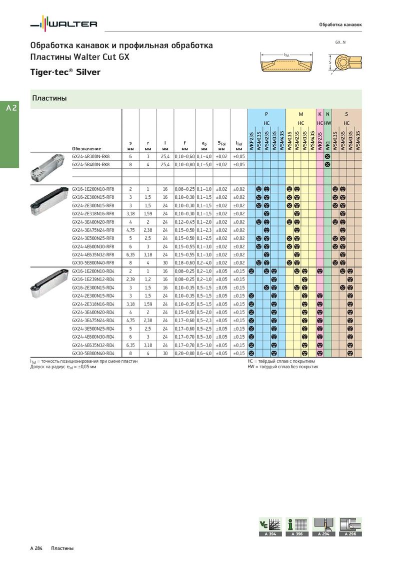 Обработка канавок Обработка канавок и профильная обработка GX...N Пластины Walter Cut GX lTol. S Tiger·tec® Silver r Пластины A2 P M K N S HC HC HC HW HC s r l f ap STol lTol WKP23S WSM13S WSM23S WSM33S WSM43S WSM13S WSM23S WSM33S WSM43S WKP23S WK1 WSM13S WSM23S WSM33S WSM43S Обозначение мм мм мм мм мм мм мм GX24-4R300N-RK8 6 3 25,4 0,10–0,60 0,1–4,0 ±0,02 ±0,05 a GX24-5R400N-RK8 8 4 25,4 0,10–0,80 0,1–5,0 ±0,02 ±0,05 a GX16-1E200N10-RF8 2 1 16 0,08–0,25 0,1–1,0 ±0,02 ±0,02 ab ab a b GX16-2E300N15-RF8 3 1,5 16 0,10–0,30 0,1–1,5 ±0,02 ±0,02 ab ab a b GX24-2E300N15-RF8 3 1,5 24 0,10–0,30 0,1–1,5 ±0,02 ±0,02 ab ab a b GX24-2E318N16-RF8 3,18 1,59 24 0,10–0,30 0,1–1,5 ±0,02 ±0,02 b b b GX24-3E400N20-RF8 4 2 24 0,12–0,45 0,1–2,0 ±0,02 ±0,02 ab ab a b GX24-3E475N24-RF8 4,75 2,38 24 0,15–0,50 0,1–2,3 ±0,02 ±0,02 b b b GX24-3E500N25-RF8 5 2,5 24 0,15–0,50 0,1–2,5 ±0,02 ±0,02 ab ab a b GX24-4E600N30-RF8 6 3 24 0,15–0,55 0,1–3,0 ±0,02 ±0,02 ab ab a b GX24-4E635N32-RF8 6,35 3,18 24 0,15–0,55 0,1–3,0 ±0,02 ±0,02 b b b GX30-5E800N40-RF8 8 4 30 0,18–0,60 0,2–4,0 ±0,02 ±0,02 ab ab a b GX16-1E200N10-RD4 2 1 16 0,08–0,25 0,2–1,0 ±0,05 ±0,15 a ab ab b ab GX16-1E239N12-RD4 2,39 1,2 16 0,08–0,25 0,2–1,0 ±0,05 ±0,15 b b b GX16-2E300N15-RD4 3 1,5 16 0,10–0,35 0,5–1,5 ±0,05 ±0,15 ab ab ab GX24-2E300N15-RD4 3 1,5 24 0,10–0,35 0,5–1,5 ±0,05 ±0,15 a b b b b GX24-2E318N16-RD4 3,18 1,59 24 0,10–0,35 0,5–1,5 ±0,05 ±0,15 a b b b b GX24-3E400N20-RD4 4 2 24 0,15–0,50 0,5–2,0 ±0,05 ±0,15 a b b b b GX24-3E475N24-RD4 4,75 2,38 24 0,17–0,60 0,5–2,3 ±0,05 ±0,15 a b b b b GX24-3E500N25-RD4 5 2,5 24 0,17–0,60 0,5–2,5 ±0,05 ±0,15 a b b b b GX24-4E600N30-RD4 6 3 24 0,17–0,70 0,5–3,0 ±0,05 ±0,15 a b b b b GX24-4E635N32-RD4 6,35 3,18 24 0,17–0,70 0,5–3,0 ±0,05 ±0,15 a b b b b GX30-5E800N40-RD4 8 4 30 0,20–0,80 0,6–4,0 ±0,05 ±0,15 a b b b b lTol = точность позиционирования при смене пластин HC = твёрдый сплав с покрытием Допуск на радиус rTol = ±0,05 мм HW = твёрдый сплав без покрытия A 394 A 396 A 294 A 296 A 284 Пластины
