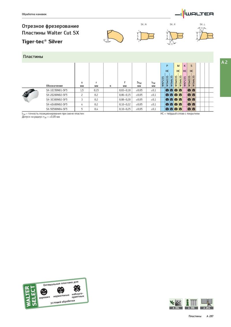 Обработка канавок Отрезное фрезерование SX...N SX...R SX...L χ Пластины Walter Cut SX r r r S S S Tiger·tec® Silver 6° r r r χ Пластины A2 P M K S HC HC HC HC s r f STol lTol WKP23S WSM33S WSM43S WSM33S WSM43S WKP23S WSM33S WSM43S Обозначение мм мм κ мм мм мм SX-1E150N01-SF5 1,5 0,15 0,03–0,10 ±0,05 ±0,1 bcbc bc SX-2E200N02-SF5 2 0,2 0,06–0,15 ±0,05 ±0,1 bcbc bc SX-3E300N02-SF5 3 0,2 0,08–0,20 ±0,05 ±0,1 bcbc bc SX-4E400N02-SF5 4 0,2 0,10–0,22 ±0,05 ±0,1 bcbc bc SX-5E500N04-SF5 5 0,4 0,10–0,25 ±0,05 ±0,1 bcbc bc lTol = точность позиционирования при смене пластин HC = твёрдый сплав с покрытием Допуск на радиус rTol = ±0,05 мм Оптимальная пластина для хороших нормальных пнреиблятангыо-х условий обработки A 394 A 396 A 294 Пластины A 287