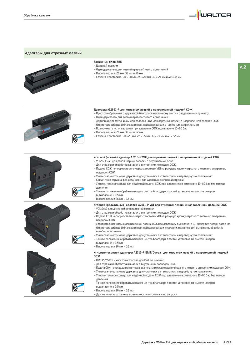 Обработка канавок Адаптеры для отрезных лезвий Зажимный блок SBN – Цельный прижим A2 – Один держатель для лезвий правого/левого исполнений – Высота лезвия: 26 мм, 32 мм и 46 мм – Сечение хвостовика: 20 × 20 мм, 25 × 20 мм, 32 × 29 мм и 40 × 37 мм Державки G2661-P для отрезных лезвий с направленной подачей СОЖ – Простота обращения с державкой благодаря наклонному винту и разделенному прихвату – Один держатель для лезвий правого/левого исполнений – Державки с переходником для подвода СОЖ для отрезных лезвий с направленной подачей СОЖ – Отсутствие вибраций благодаря прочной конструкции с надёжным закреплением – Возможность использования при давлении СОЖ в диапазоне 10–80 бар – Высота лезвия: 26 мм, 32 мм и 52 мм – Сечение хвостовика: 20 × 20 мм, 25 × 25 мм, 32 × 25 мм и 40 × 32 мм Угловой (осевой) адаптер A2110-P VDI для отрезных лезвий с направленной подачей СОЖ – VDI25/30/40 для револьверной головки с вертикальной осью – Для отрезки и обработки канавок с внутренним подводом СОЖ – Подача СОЖ непосредственно через хвостовик VDI на режущую кромку отрезного лезвия с внутренним подводом СОЖ – Универсальность: одна державка для установки в стандартном и перевёрнутом положениях – Сегментная стружка, без остановок для удаления скоплений стружки – Уплотнительное кольцо для надёжной подачи СОЖ под давлением в диапазоне 10–80 бар без потери давления – Точное положение обрабатывающего центра благодаря простой установке по высоте центров в диапазоне ± 0,5 мм – Высота лезвия 26 мм и 32 мм Угловой (радиальный) адаптер A2111-P VDI для отрезных лезвий с направленной подачей СОЖ – VDI30/40 для дисковой револьверной головки – Для отрезки и обработки канавок с внутренним подводом СОЖ – Подача СОЖ непосредственно через хвостовик VDI на режущую кромку отрезного лезвия с внутренним подводом СОЖ – Уплотнительное кольцо для надёжной подачи СОЖ под давлением в диапазоне 10–80 бар без потери давления – Отсутствие вибраций благодаря прочной конструкции державки, позволяющей выполнять обработку в любом положении – Универсальность: одна державка для установки в стандартном и перевёрнутом положениях – Точное положение обрабатывающего центра благодаря простой установке по высоте центров в диапазоне ± 0,5 мм – Высота лезвия 26 мм и 32 мм Угловые (осевые) адаптеры A2110-P BMT/Doosan для отрезных лезвий с направленной подачей СОЖ – BMT45/55/65 и хвостовик Doosan для Bolt on Revolver – Для отрезки и обработки канавок с внутренним подводом СОЖ – Подача СОЖ непосредственно через адаптер на режущую кромку отрезного лезвия с внутренним подводом СОЖ – Универсальность: одна державка для установки в стандартном и перевёрнутом положениях – Уплотнительное кольцо для надёжной подачи СОЖ под давлением в диапазоне 10–80 бар без потери давления – Точное положение обрабатывающего центра благодаря простой установке по высоте центров в диапазоне ± 0,5 мм – Высота лезвия 26 мм и 32 мм – Другие типы хвостовиков в зависимости от станка – по запросу Державки Walter Cut для отрезки и обработки канавок A 293