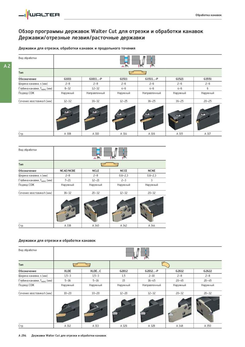 Обработка канавок Обзор программы державок Walter Cut для отрезки и обработки канавок Державки/отрезные лезвия/расточные державки Державки для отрезки, обработки канавок и продольного точения Вид обработки A2 Тип Обозначение G1011 G1011...-P G1511 G1511...-P G1521 G1551 Ширина канавки, s [мм] 2–8 2–8 2–6 2–6 2–6 2–6 Глубина канавки, Tмакс [мм] 8–32 12–32 4–6 4–6 4–6 6 Подвод СОЖ Наружный Направленный Наружный Направленный Наружный Наружный Сечение хвостовика h [мм] 12–32 16–32 12–25 16–25 16–25 20–25 Cтр. A 308 A 310 A 314 A 316 A 315 A 317 Вид обработки Тип Обозначение NCAE/NCBE NCLE NCCE NCNE Ширина канавки, s [мм] 2–8 2–8 0,6–2,3 0,6–2,3 Глубина канавки, Tмакс [мм] 7–21 12–21 2–3 3 Подвод СОЖ Наружный Наружный Наружный Наружный Сечение хвостовика h [мм] 16–32 20–32 12–32 20–32 Cтр. A 338 A 340 A 342 A 344 Державки для отрезки и обработки канавок Вид обработки Тип Обозначение XLDE XLDE...C G2012 G2012...-P G2612 G2622 Ширина канавки, s [мм] 1,5–3 1,5–3 1,5 2–10 2–8 2–8 Глубина канавки, Tмакс [мм] 5–16 5–16 15 16–45 20–45 20–45 Подвод СОЖ Наружный Наружный Наружный Направленный Наружный Наружный Сечение хвостовика h [мм] 10–20 10–20 12–20 12–32 20–32 20–32 Cтр. A 312 A 313 A 326 A 328 A 348 A 350 A 294 Державки Walter Cut для отрезки и обработки канавок