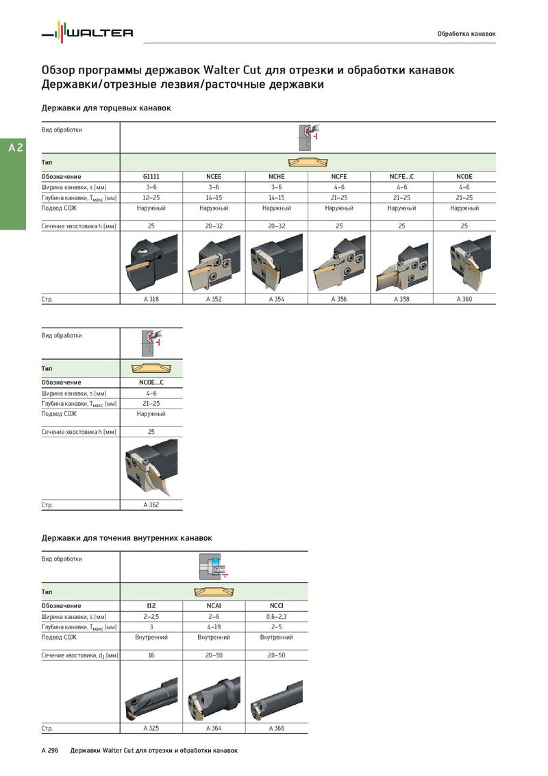 Обработка канавок Обзор программы державок Walter Cut для отрезки и обработки канавок Державки/отрезные лезвия/расточные державки Державки для торцевых канавок Вид обработки A2 Тип Обозначение G1111 NCEE NCHE NCFE NCFE...C NCOE Ширина канавки, s [мм] 3–6 3–6 3–6 4–6 4–6 4–6 Глубина канавки, Tмакс [мм] 12–25 14–15 14–15 21–25 21–25 21–25 Подвод СОЖ Наружный Наружный Наружный Наружный Наружный Наружный Сечение хвостовика h [мм] 25 20–32 20–32 25 25 25 Cтр. A 318 A 352 A 354 A 356 A 358 A 360 Вид обработки Тип Обозначение NCOE...C Ширина канавки, s [мм] 4–6 Глубина канавки, Tмакс [мм] 21–25 Подвод СОЖ Наружный Сечение хвостовика h [мм] 25 Cтр. A 362 Державки для точения внутренних канавок Вид обработки Тип Обозначение I12 NCAI NCCI Ширина канавки, s [мм] 2–2,5 2–6 0,6–2,3 Глубина канавки, Tмакс [мм] 3 4–19 2–5 Подвод СОЖ Внутренний Внутренний Внутренний Сечение хвостовика, d1 [мм] 16 20–50 20–50 Cтр. A 325 A 364 A 366 A 296 Державки Walter Cut для отрезки и обработки канавок