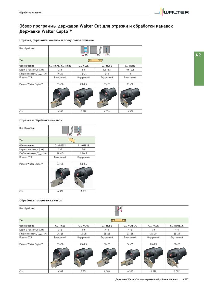 Обработка канавок Обзор программы державок Walter Cut для отрезки и обработки канавок Державки Walter Capto™ Отрезка, обработка канавок и продольное точение Вид обработки A2 Тип Обозначение C...-NCAE/ C...-NCBE C...-NCLE C...-NCCE C...-NCNE Ширина канавки, s [мм] 2–8 2–8 0,6–2,3 0,6–2,3 Глубина канавки, Tмакс [мм] 7–21 12–21 2–3 3 Подвод СОЖ Внутренний Внутренний Внутренний Внутренний Размер Walter Capto™ C3–C6 C3–C6 C3–C6 C3–C6 Cтр. A 368 A 372 A 374 A 376 Отрезка и обработка канавок Вид обработки Тип Обозначение C...-G2612 C...-G2622 Ширина канавки, s [мм] 2–8 2–8 Глубина канавки, Tмакс [мм] 20–45 20–45 Подвод СОЖ Внутренний Внутренний Размер Walter Capto™ C3–C6 C3–C6 Cтр. A 378 A 380 Обработка торцевых канавок Вид обработки Тип Обозначение C...-NCEE C...-NCHE C...-NCFE C...-NCFE...C C...-NCOE C...-NCOE...C Ширина канавки, s [мм] 3–6 3–6 4–6 4–6 4–6 4–6 Глубина канавки, Tмакс [мм] 14–15 14–15 21–25 21–25 21–25 21–25 Подвод СОЖ Внутренний Внутренний Внутренний Внутренний Внутренний Внутренний Размер Walter Capto™ C3–C6 C4–C6 C4–C5 C4–C5 C4–C5 C4–C5 Cтр. A 382 A 384 A 386 A 388 A 390 A 392 Державки Walter Cut для отрезки и обработки канавок A 297