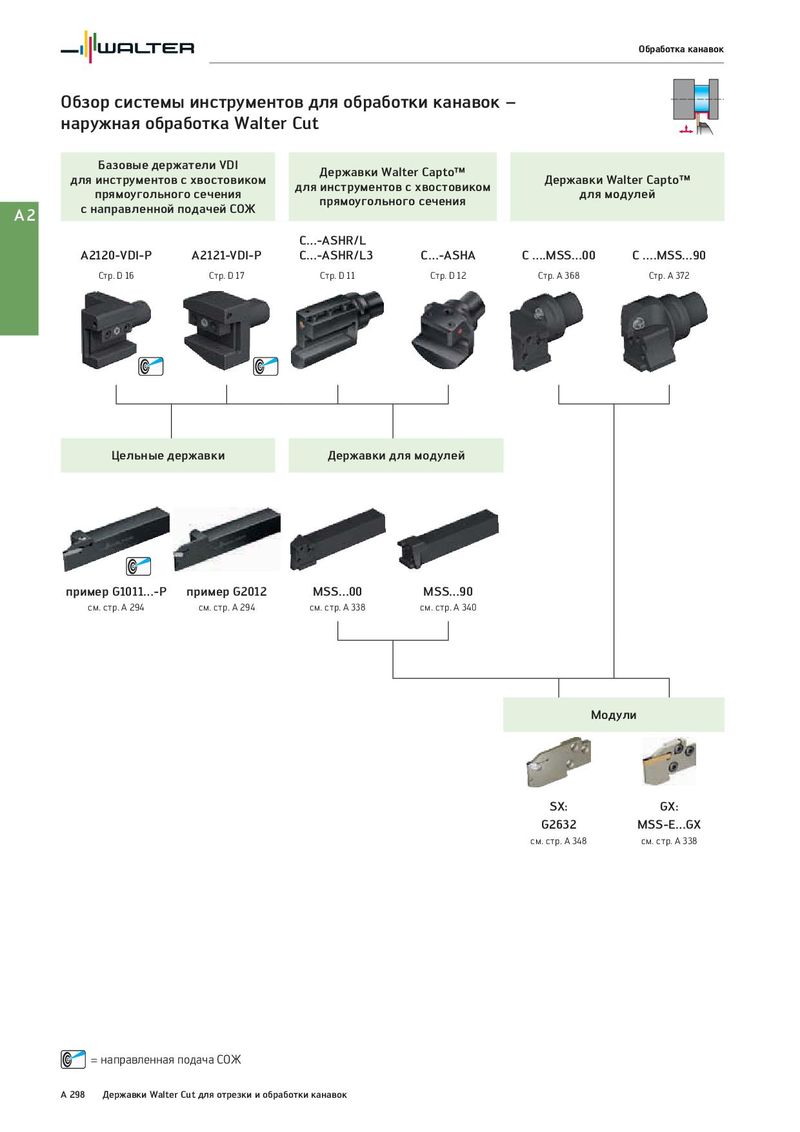 Обработка канавок Обзор системы инструментов для обработки канавок – наружная обработка Walter Cut Базовые держатели VDI Державки Walter Capto™ для инструментов с хвостовиком для инструментов с хвостовиком Державки Walter Capto™ прямоугольного сечения прямоугольного сечения для модулей A2 с направленной подачей СОЖ C…-ASHR/L A2120-VDI-P A2121-VDI-P C…-ASHR/L3 C…-ASHA C ….MSS…00 C ….MSS…90 Стр. D 16 Стр. D 17 Стр. D 11 Стр. D 12 Стр. A 368 Стр. A 372 Цельные державки Державки для модулей пример G1011…-P пример G2012 MSS…00 MSS…90 см. стр. A 294 см. стр. A 294 см. стр. A 338 см. стр. A 340 Модули SX: GX: G2632 MSS-E…GX см. стр. A 348 см. стр. A 338 = направленная подача СОЖ A 298 Державки Walter Cut для отрезки и обработки канавок