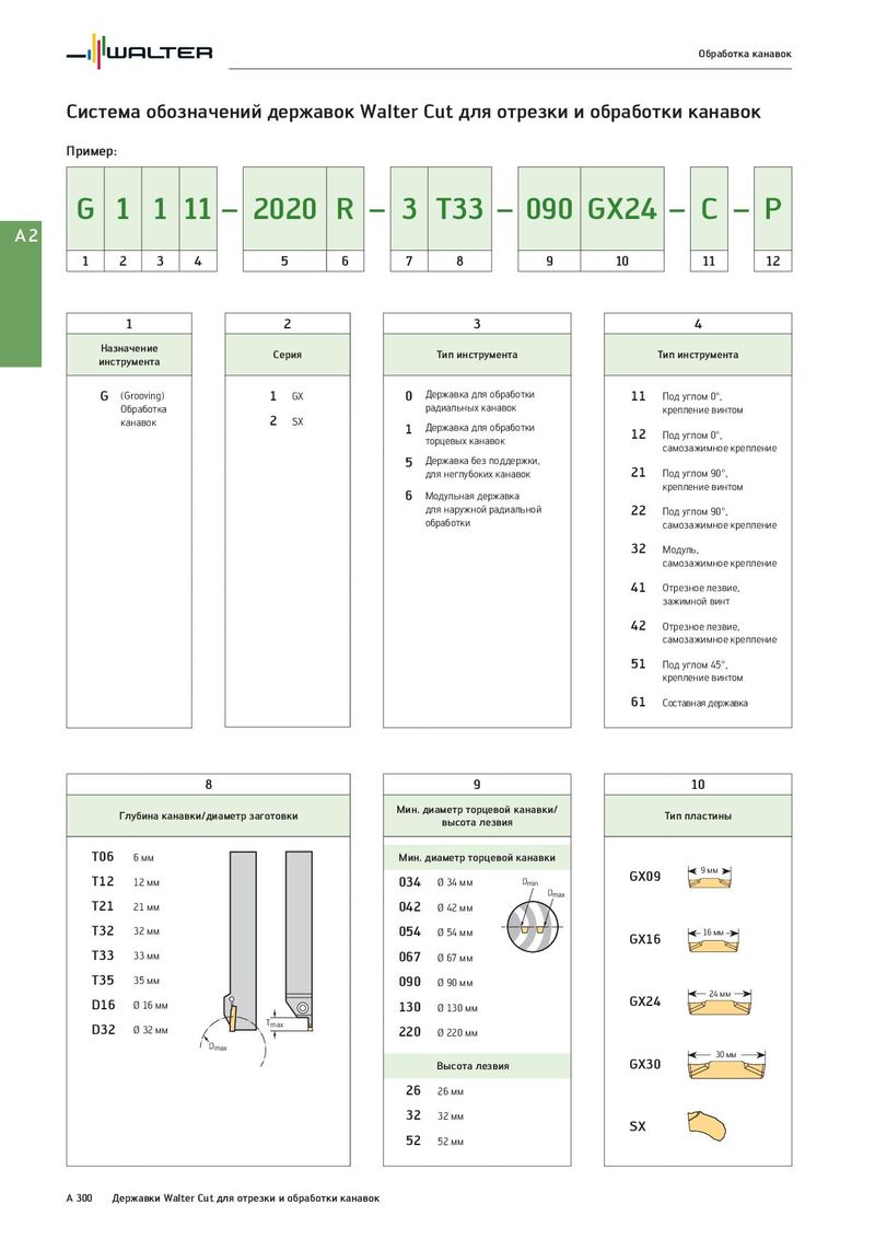 Обработка канавок Система обозначений державок Walter Cut для отрезки и обработки канавок Пример: G 1 1 11 – 2020 R – 3 T33 – 090 GX24 – C – P A2 1 2 3 4 5 6 7 8 9 10 11 12 1 2 3 4 Назначение Серия Тип инструмента Тип инструмента инструмента G (Grooving) 1 GX 0 Державка для обработки 11 Под углом 0°, Обработка радиальных канавок крепление винтом канавок 2 SX 1 Державка для обработки торцевых канавок 12 Под углом 0°, самозажимное крепление 5 Державка без поддержки, для неглубоких канавок 21 Под углом 90°, 6 крепление винтом Модульная державка для наружной радиальной 22 Под углом 90°, обработки самозажимное крепление 32 Модуль, самозажимное крепление 41 Отрезное лезвие, зажимной винт 42 Отрезное лезвие, самозажимное крепление 51 Под углом 45°, крепление винтом 61 Составная державка 8 9 10 Глубина канавки/диаметр заготовки Мин. диаметр торцевой канавки/ Тип пластины высота лезвия T06 6 мм Мин. диаметр торцевой канавки GX09 9 мм T12 12 мм 034 Ø 34 мм Dmin Dmax T21 21 мм 042 Ø 42 мм T32 32 мм 054 Ø 54 мм GX16 16 мм T33 33 мм 067 Ø 67 мм T35 35 мм 090 Ø 90 мм GX24 24 мм D16 Ø 16 мм 130 Ø 130 мм D32 Ø 32 мм Tmax 220 Ø 220 мм Dmax 30 мм Высота лезвия GX30 26 26 мм 32 32 мм SX 52 52 мм A 300 Державки Walter Cut для отрезки и обработки канавок