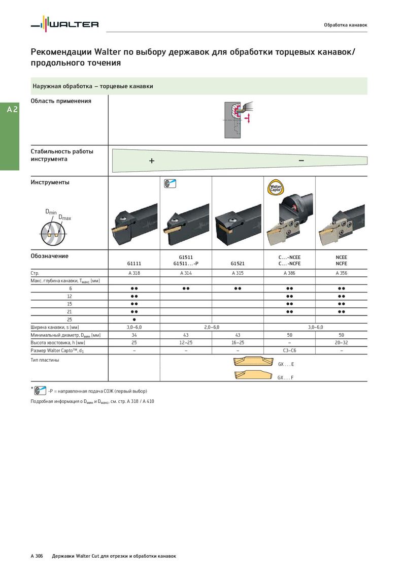 Обработка канавок Рекомендации Walter по выбору державок для обработки торцевых канавок/ продольного точения Наружная обработка – торцевые канавки Область применения A2 Стабильность работы инструмента + – Инструменты Dmin Dmax Обозначение G1511 C . . . -NCEE NCEE G1111 G1511 . . . -P G1521 C . . . -NCFE NCFE Cтр. A 318 A 314 A 315 A 386 A 356 Макс. глубина канавки, Tмакс [мм] 6 CC CC CC CC CC 12 CC CC CC 15 CC CC CC 21 CC CC CC 25 C Ширина канавки, s [мм] 3,0–6,0 2,0–6,0 3,0–6,0 Минимальный диаметр, Dмин [мм] 34 43 43 50 50 Высота хвостовика, h [мм] 25 12–25 16–25 – 20–32 Размер Walter Capto™, d1 – – – C3–C6 – Тип пластины GX . . . E GX . . . F * -P = направленная подача СОЖ (первый выбор) Подробная информация о Dмин и Dмакс, см. стр. A 318 / A 410 A 306 Державки Walter Cut для отрезки и обработки канавок