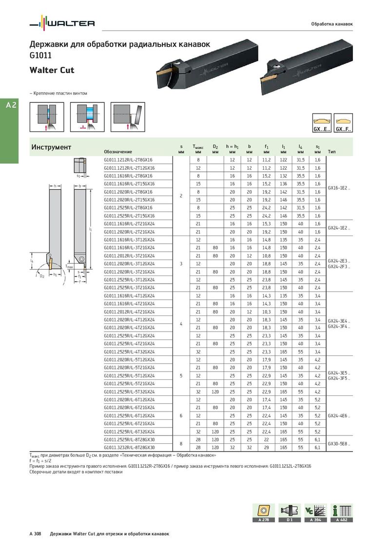Обработка канавок Державки для обработки радиальных канавок G1011 Walter Cut – Крепление пластин винтом A2 Инструмент s Tмакс D2 h = h1 b f1 l1 l4 s1 Обозначение мм мм мм мм мм мм мм мм мм Тип G1011.1212R/L-2T8GX16 8 12 12 11,2 122 31,5 1,6 G1011.1212R/L-2T12GX16 12 12 12 11,2 122 31,5 1,6 s1 G1011.1616R/L-2T8GX16 8 16 16 15,2 132 35,5 1,6 h b G1011.1616R/L-2T15GX16 15 16 16 15,2 136 35,5 1,6 GX16-1E2 .. G1011.2020R/L-2T8GX16 8 20 20 19,2 142 31,5 1,6 2 G1011.2020R/L-2T15GX16 15 20 20 19,2 146 35,5 1,6 G1011.2525R/L-2T8GX16 8 25 25 24,2 142 31,5 1,6 G1011.2525R/L-2T15GX16 15 25 25 24,2 146 35,5 1,6 G1011.1616R/L-2T21GX24 21 16 16 15,3 150 40 1,6 l1 GX24-1E2 .. G1011.2020R/L-2T21GX24 21 20 20 19,2 150 40 1,6 G1011.1616R/L-3T12GX24 12 16 16 14,8 135 35 2,4 G1011.1616R/L-3T21GX24 21 80 16 16 14,8 150 40 2,4 G1011.2012R/L-3T21GX24 21 80 20 12 10,8 150 40 2,4 l4 G1011.2020R/L-3T12GX24 3 12 20 20 18,8 145 35 2,4 GX24-2E3 .. Tmax GX24-2F3 .. h1 s G1011.2020R/L-3T21GX24 21 80 20 20 18,8 150 40 2,4 D2 f1 G1011.2525R/L-3T12GX24 12 25 25 23,8 145 35 2,4 f G1011.2525R/L-3T21GX24 21 80 25 25 23,8 150 40 2,4 G1011.1616R/L-4T12GX24 12 16 16 14,3 135 35 3,4 G1011.1616R/L-4T21GX24 21 80 16 16 14,3 150 40 3,4 G1011.2012R/L-4T21GX24 21 80 20 12 10,3 150 40 3,4 G1011.2020R/L-4T12GX24 12 20 20 18,3 145 35 3,4 GX24-3E4 .. 4 GX24-3F4 .. G1011.2020R/L-4T21GX24 21 80 20 20 18,3 150 40 3,4 G1011.2525R/L-4T12GX24 12 25 25 23,3 145 35 3,4 G1011.2525R/L-4T21GX24 21 80 25 25 23,3 150 40 3,4 G1011.2525R/L-4T32GX24 32 25 25 23,3 165 55 3,4 G1011.2020R/L-5T12GX24 12 20 20 17,9 145 35 4,2 G1011.2020R/L-5T21GX24 21 80 20 20 17,9 150 40 4,2 G1011.2525R/L-5T12GX24 5 12 25 25 22,9 145 35 4,2 GX24-3E5 .. GX24-3F5 .. G1011.2525R/L-5T21GX24 21 80 25 25 22,9 150 40 4,2 G1011.2525R/L-5T32GX24 32 120 25 25 22,9 165 55 4,2 G1011.2020R/L-6T12GX24 12 20 20 17,4 145 35 5,2 G1011.2020R/L-6T21GX24 21 80 20 20 17,4 150 40 5,2 G1011.2525R/L-6T12GX24 6 12 25 25 22,4 145 35 5,2 GX24-4E6 .. G1011.2525R/L-6T21GX24 21 80 25 25 22,4 150 40 5,2 G1011.2525R/L-6T32GX24 32 120 25 25 22,4 165 55 5,2 G1011.2525R/L-8T28GX30 28 120 25 25 22 165 55 6,1 8 GX30-5E8 .. G1011.3232R/L-8T28GX30 28 120 32 32 29 165 55 6,1 Tмакс при диаметрах больше D2 см. в разделе «Техническая информация – Обработка канавок» f = f1 + s/2 Пример заказа инструмента правого исполнения: G1011.1212R-2T8GX16 / пример заказа инструмента левого исполнения: G1011.1212L-2T8GX16 Сборочные детали входят в комплект поставки A 278 D1 A 394 A 402 A 308 Державки Walter Cut для отрезки и обработки канавок