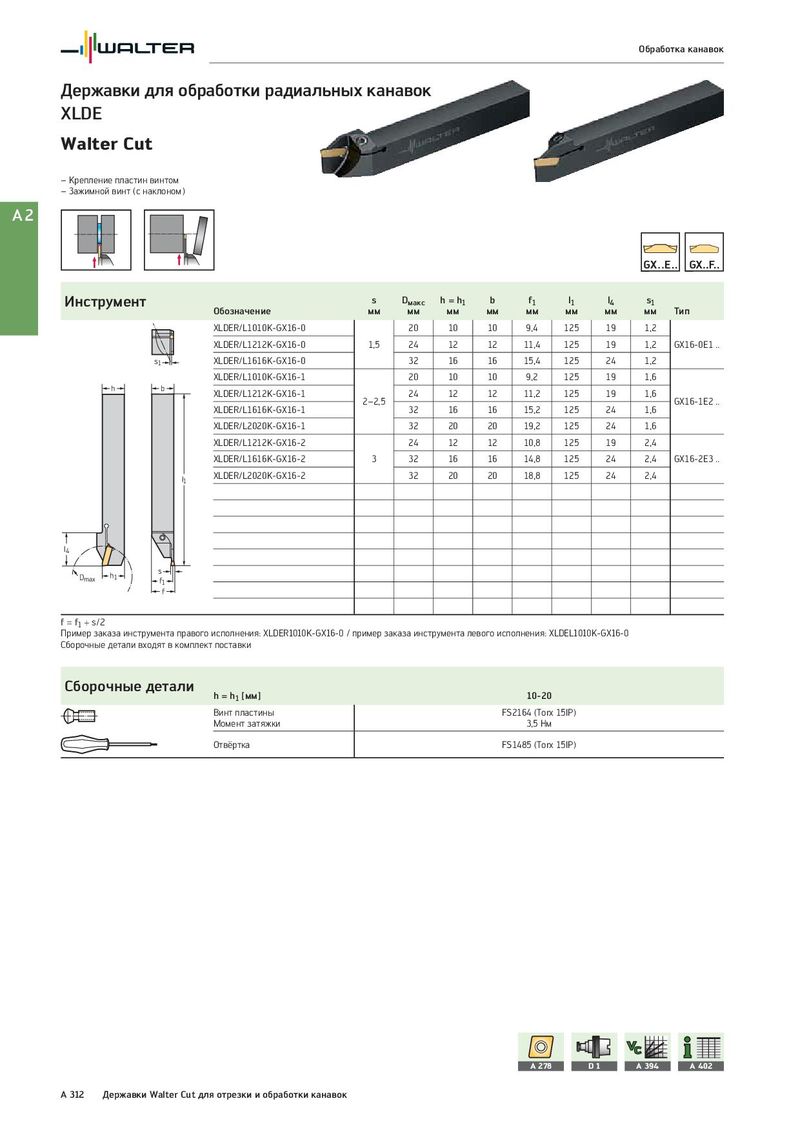 Обработка канавок Державки для обработки радиальных канавок XLDE Walter Cut – Крепление пластин винтом – Зажимной винт (с наклоном) A2 Инструмент s Dмакс h = h1 b f1 l1 l4 s1 Обозначение мм мм мм мм мм мм мм мм Тип XLDER/L1010K-GX16-0 20 10 10 9,4 125 19 1,2 XLDER/L1212K-GX16-0 1,5 24 12 12 11,4 125 19 1,2 GX16-0E1 .. s1 XLDER/L1616K-GX16-0 32 16 16 15,4 125 24 1,2 XLDER/L1010K-GX16-1 20 10 10 9,2 125 19 1,6 h b XLDER/L1212K-GX16-1 24 12 12 11,2 125 19 1,6 2–2,5 GX16-1E2 .. XLDER/L1616K-GX16-1 32 16 16 15,2 125 24 1,6 XLDER/L2020K-GX16-1 32 20 20 19,2 125 24 1,6 XLDER/L1212K-GX16-2 24 12 12 10,8 125 19 2,4 XLDER/L1616K-GX16-2 3 32 16 16 14,8 125 24 2,4 GX16-2E3 .. l1 XLDER/L2020K-GX16-2 32 20 20 18,8 125 24 2,4 l4 Dmax h1 s f1 f f = f1 + s/2 Пример заказа инструмента правого исполнения: XLDER1010K-GX16-0 / пример заказа инструмента левого исполнения: XLDEL1010K-GX16-0 Сборочные детали входят в комплект поставки Сборочные детали h = h1 [мм] 10-20 Винт пластины FS2164 (Torx 15IP) Момент затяжки 3,5 Нм Отвёртка FS1485 (Torx 15IP) A 278 D1 A 394 A 402 A 312 Державки Walter Cut для отрезки и обработки канавок