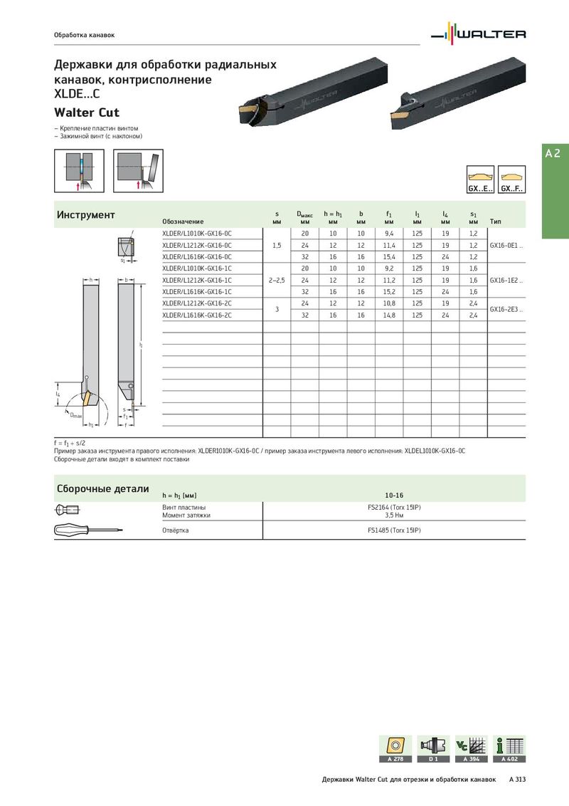 Обработка канавок Державки для обработки радиальных канавок, контрисполнение XLDE...C Walter Cut – Крепление пластин винтом – Зажимной винт (с наклоном) A2 Инструмент s Dмакс h = h1 b f1 l1 l4 s1 Обозначение мм мм мм мм мм мм мм мм Тип XLDER/L1010K-GX16-0C 20 10 10 9,4 125 19 1,2 XLDER/L1212K-GX16-0C 1,5 24 12 12 11,4 125 19 1,2 GX16-0E1 .. s1 XLDER/L1616K-GX16-0C 32 16 16 15,4 125 24 1,2 XLDER/L1010K-GX16-1C 20 10 10 9,2 125 19 1,6 h b XLDER/L1212K-GX16-1C 2–2,5 24 12 12 11,2 125 19 1,6 GX16-1E2 .. XLDER/L1616K-GX16-1C 32 16 16 15,2 125 24 1,6 XLDER/L1212K-GX16-2C 24 12 12 10,8 125 19 2,4 3 GX16-2E3 .. XLDER/L1616K-GX16-2C 32 16 16 14,8 125 24 2,4 l1 l4 s Dmax f1 h1 f f = f1 + s/2 Пример заказа инструмента правого исполнения: XLDER1010K-GX16-0C / пример заказа инструмента левого исполнения: XLDEL1010K-GX16-0C Сборочные детали входят в комплект поставки Сборочные детали h = h1 [мм] 10-16 Винт пластины FS2164 (Torx 15IP) Момент затяжки 3,5 Нм Отвёртка FS1485 (Torx 15IP) A 278 D1 A 394 A 402 Державки Walter Cut для отрезки и обработки канавок A 313