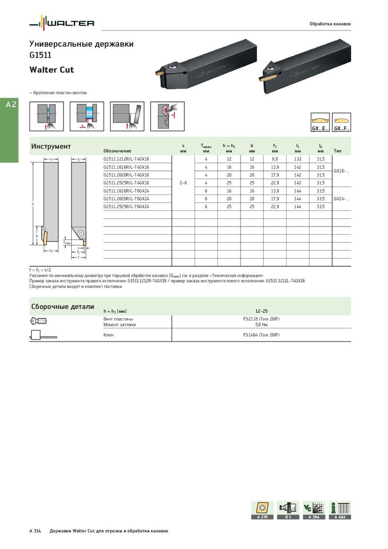 Обработка канавок Универсальные державки G1511 Walter Cut – Крепление пластин винтом A2 Инструмент s Tмакс h = h1 b f1 l1 l4 Обозначение мм мм мм мм мм мм мм Тип h b G1511.1212R/L-T4GX16 4 12 12 9,9 132 31,5 G1511.1616R/L-T4GX16 4 16 16 13,9 142 31,5 GX16- .. G1511.2020R/L-T4GX16 4 20 20 17,9 142 31,5 G1511.2525R/L-T4GX16 2–6 4 25 25 22,9 142 31,5 G1511.1616R/L-T6GX24 6 16 16 13,9 144 33,5 G1511.2020R/L-T6GX24 6 20 20 17,9 144 33,5 GX24- .. l1 G1511.2525R/L-T6GX24 6 25 25 22,9 144 33,5 l4 Tmax h1 s f1 f f = f1 + s/2 Указания по минимальному диаметру при торцевой обработке канавок [Dмин] см. в разделе «Техническая информация» Пример заказа инструмента правого исполнения: G1511.1212R-T4GX16 / пример заказа инструмента левого исполнения: G1511.1212L-T4GX16 Сборочные детали входят в комплект поставки Сборочные детали h = h1 [мм] 12-25 Винт пластины FS2118 (Torx 20IP) Момент затяжки 5,0 Нм Ключ FS1464 (Torx 20IP) A 278 D1 A 394 A 402 A 314 Державки Walter Cut для отрезки и обработки канавок