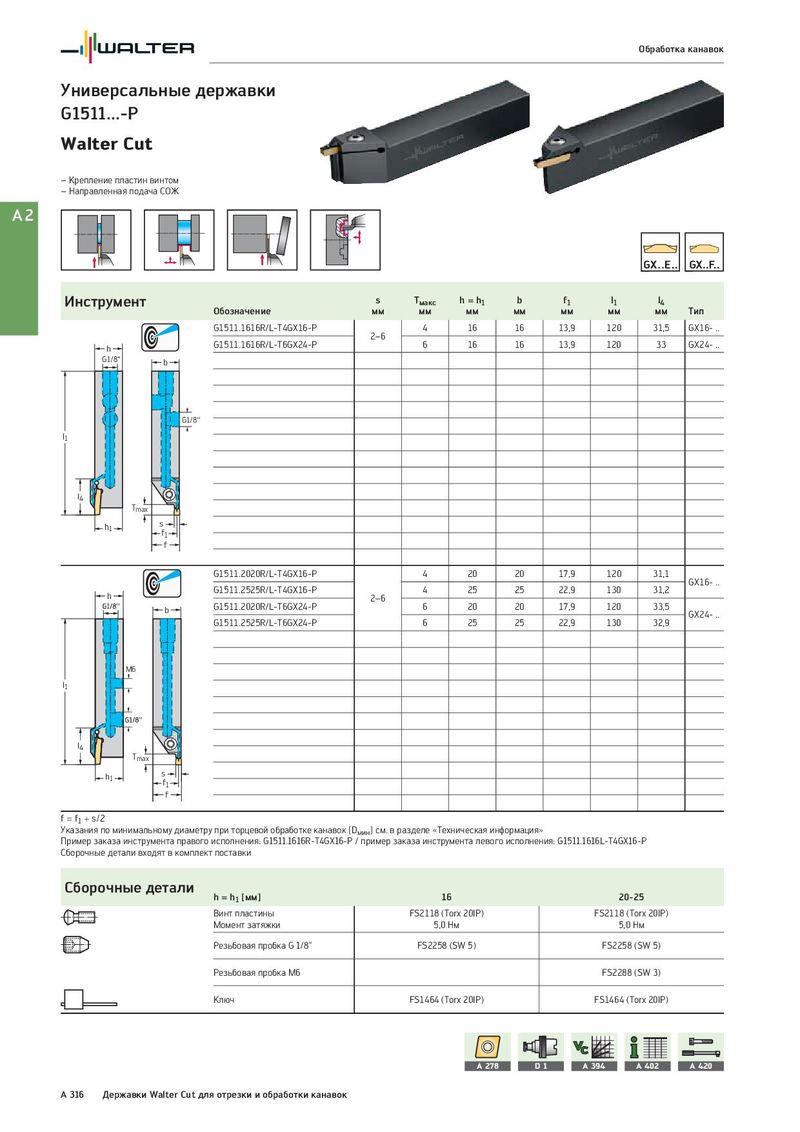 Обработка канавок Универсальные державки G1511...-P Walter Cut – Крепление пластин винтом – Направленная подача СОЖ A2 Инструмент s Tмакс h = h1 b f1 l1 l4 Обозначение мм мм мм мм мм мм мм Тип G1511.1616R/L-T4GX16-P 4 16 16 13,9 120 31,5 GX16- .. 2–6 h G1511.1616R/L-T6GX24-P 6 16 16 13,9 120 33 GX24- .. G1/8'' b G1/8'' l1 l4 Tmax h1 s f1 f G1511.2020R/L-T4GX16-P 4 20 20 17,9 120 31,1 GX16- .. h G1511.2525R/L-T4GX16-P 4 25 25 22,9 130 31,2 '' 2–6 b G1511.2020R/L-T6GX24-P 6 20 20 17,9 120 33,5 GX24- .. G1511.2525R/L-T6GX24-P 6 25 25 22,9 130 32,9 M6 l1 '' l4 Tmax h1 s f1 f f = f1 + s/2 Указания по минимальному диаметру при торцевой обработке канавок [Dмин] см. в разделе «Техническая информация» Пример заказа инструмента правого исполнения: G1511.1616R-T4GX16-P / пример заказа инструмента левого исполнения: G1511.1616L-T4GX16-P Сборочные детали входят в комплект поставки Сборочные детали h = h1 [мм] 16 20-25 Винт пластины FS2118 (Torx 20IP) FS2118 (Torx 20IP) Момент затяжки 5,0 Нм 5,0 Нм Резьбовая пробка G 1/8" FS2258 (SW 5) FS2258 (SW 5) Резьбовая пробка M6 FS2288 (SW 3) Ключ FS1464 (Torx 20IP) FS1464 (Torx 20IP) A 278 D1 A 394 A 402 A 420 A 316 Державки Walter Cut для отрезки и обработки канавок