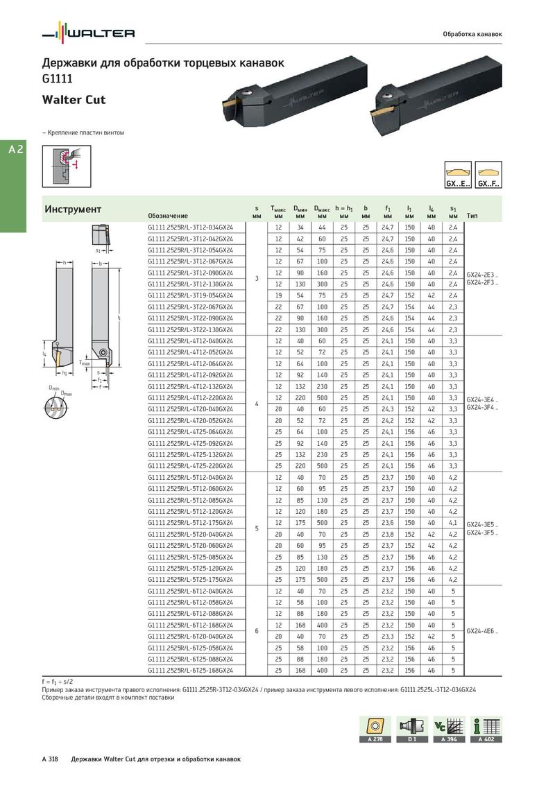 Обработка канавок Державки для обработки торцевых канавок G1111 Walter Cut – Крепление пластин винтом A2 Инструмент s Tмакс Dмин Dмакс h = h1 b f1 l1 l4 s1 Обозначение мм мм мм мм мм мм мм мм мм мм Тип G1111.2525R/L-3T12-034GX24 12 34 44 25 25 24,7 150 40 2,4 G1111.2525R/L-3T12-042GX24 12 42 60 25 25 24,7 150 40 2,4 s1 G1111.2525R/L-3T12-054GX24 12 54 75 25 25 24,6 150 40 2,4 h b G1111.2525R/L-3T12-067GX24 12 67 100 25 25 24,6 150 40 2,4 G1111.2525R/L-3T12-090GX24 12 90 160 25 25 24,6 150 40 2,4 GX24-2E3 .. 3 GX24-2F3 .. G1111.2525R/L-3T12-130GX24 12 130 300 25 25 24,6 150 40 2,4 G1111.2525R/L-3T19-054GX24 19 54 75 25 25 24,7 152 42 2,4 G1111.2525R/L-3T22-067GX24 22 67 100 25 25 24,7 154 44 2,3 l1 G1111.2525R/L-3T22-090GX24 22 90 160 25 25 24,6 154 44 2,3 G1111.2525R/L-3T22-130GX24 22 130 300 25 25 24,6 154 44 2,3 G1111.2525R/L-4T12-040GX24 12 40 60 25 25 24,1 150 40 3,3 l4 G1111.2525R/L-4T12-052GX24 12 52 72 25 25 24,1 150 40 3,3 Tmax G1111.2525R/L-4T12-064GX24 12 64 100 25 25 24,1 150 40 3,3 h1 s G1111.2525R/L-4T12-092GX24 12 92 140 25 25 24,1 150 40 3,3 f1 Dmin f G1111.2525R/L-4T12-132GX24 12 132 230 25 25 24,1 150 40 3,3 Dmax G1111.2525R/L-4T12-220GX24 12 220 500 25 25 24,1 150 40 3,3 4 GX24-3E4 .. G1111.2525R/L-4T20-040GX24 20 40 60 25 25 24,3 152 42 3,3 GX24-3F4 .. G1111.2525R/L-4T20-052GX24 20 52 72 25 25 24,2 152 42 3,3 G1111.2525R/L-4T25-064GX24 25 64 100 25 25 24,1 156 46 3,3 G1111.2525R/L-4T25-092GX24 25 92 140 25 25 24,1 156 46 3,3 G1111.2525R/L-4T25-132GX24 25 132 230 25 25 24,1 156 46 3,3 G1111.2525R/L-4T25-220GX24 25 220 500 25 25 24,1 156 46 3,3 G1111.2525R/L-5T12-040GX24 12 40 70 25 25 23,7 150 40 4,2 G1111.2525R/L-5T12-060GX24 12 60 95 25 25 23,7 150 40 4,2 G1111.2525R/L-5T12-085GX24 12 85 130 25 25 23,7 150 40 4,2 G1111.2525R/L-5T12-120GX24 12 120 180 25 25 23,7 150 40 4,2 G1111.2525R/L-5T12-175GX24 12 175 500 25 25 23,6 150 40 4,1 GX24-3E5 .. 5 GX24-3F5 .. G1111.2525R/L-5T20-040GX24 20 40 70 25 25 23,8 152 42 4,2 G1111.2525R/L-5T20-060GX24 20 60 95 25 25 23,7 152 42 4,2 G1111.2525R/L-5T25-085GX24 25 85 130 25 25 23,7 156 46 4,2 G1111.2525R/L-5T25-120GX24 25 120 180 25 25 23,7 156 46 4,2 G1111.2525R/L-5T25-175GX24 25 175 500 25 25 23,7 156 46 4,2 G1111.2525R/L-6T12-040GX24 12 40 70 25 25 23,2 150 40 5 G1111.2525R/L-6T12-058GX24 12 58 100 25 25 23,2 150 40 5 G1111.2525R/L-6T12-088GX24 12 88 180 25 25 23,2 150 40 5 G1111.2525R/L-6T12-168GX24 12 168 400 25 25 23,2 150 40 5 6 GX24-4E6 .. G1111.2525R/L-6T20-040GX24 20 40 70 25 25 23,3 152 42 5 G1111.2525R/L-6T25-058GX24 25 58 100 25 25 23,2 156 46 5 G1111.2525R/L-6T25-088GX24 25 88 180 25 25 23,2 156 46 5 G1111.2525R/L-6T25-168GX24 25 168 400 25 25 23,2 156 46 5 f = f1 + s/2 Пример заказа инструмента правого исполнения: G1111.2525R-3T12-034GX24 / пример заказа инструмента левого исполнения: G1111.2525L-3T12-034GX24 Сборочные детали входят в комплект поставки A 278 D1 A 394 A 402 A 318 Державки Walter Cut для отрезки и обработки канавок