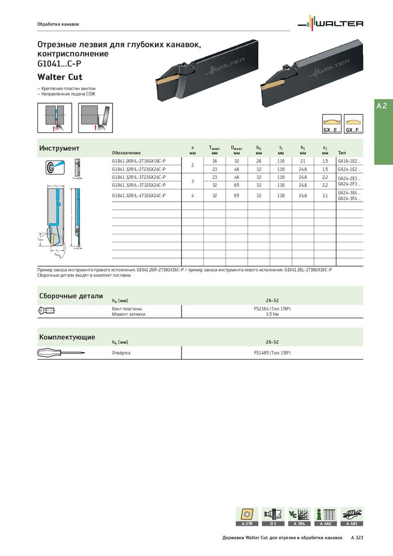 Обработка канавок Отрезные лезвия для глубоких канавок, контрисполнение G1041...C-P Walter Cut – Крепление пластин винтом – Направленная подача СОЖ A2 Инструмент s Tмакс Dмакс h4 l1 h1 s1 Обозначение мм мм мм мм мм мм мм Тип G1041.26R/L-2T16GX16C-P 16 32 26 110 21 1,5 GX16-1E2 .. 2 G1041.32R/L-2T23GX24C-P 23 46 32 110 24,6 1,5 GX24-1E2 .. s1 G1041.32R/L-3T23GX24C-P 23 46 32 110 24,6 2,2 GX24-2E3 .. 3 GX24-2F3 .. h4 G1041.32R/L-3T32GX24C-P 32 65 32 110 24,6 2,2 G1041.32R/L-4T32GX24C-P 4 32 65 32 110 24,6 3,1 GX24-3E4 .. GX24-3F4 .. l1 Tmax h1 s Dmax Пример заказа инструмента правого исполнения: G1041.26R-2T16GX16C-P / пример заказа инструмента левого исполнения: G1041.26L-2T16GX16C-P Сборочные детали входят в комплект поставки Сборочные детали h4 [мм] 26-32 Винт пластины FS2164 (Torx 15IP) Момент затяжки 3,5 Нм Комплектующие h4 [мм] 26-32 Отвёртка FS1485 (Torx 15IP) A 278 D1 A 394 A 402 A 401 Державки Walter Cut для отрезки и обработки канавок A 323