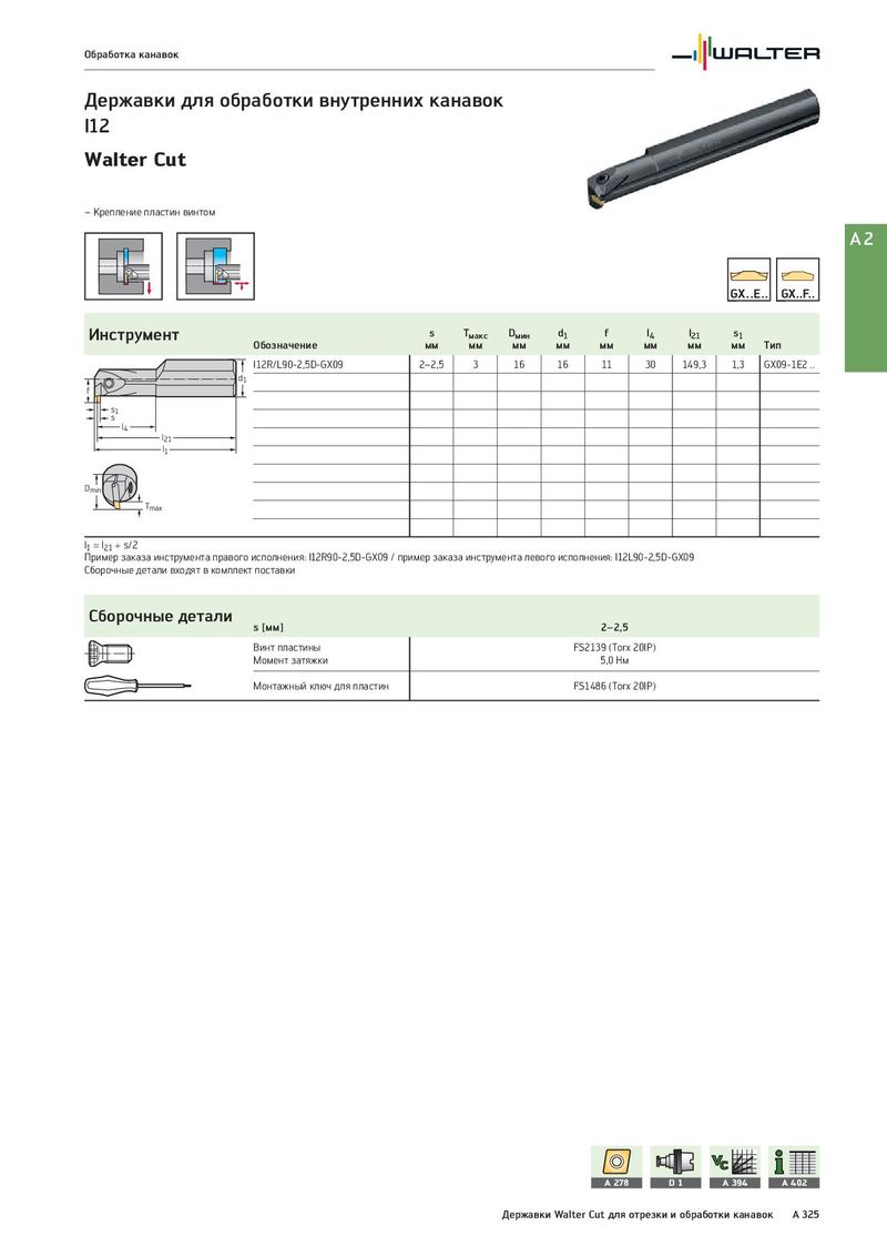 Обработка канавок Державки для обработки внутренних канавок I12 Walter Cut – Крепление пластин винтом A2 Инструмент s Tмакс Dмин d1 f l4 l21 s1 Обозначение мм мм мм мм мм мм мм мм Тип I12R/L90-2,5D-GX09 2–2,5 3 16 16 11 30 149,3 1,3 GX09-1E2 .. d1 f s1 s l4 l21 l1 Dmin Tmax l1 = l21 + s/2 Пример заказа инструмента правого исполнения: I12R90-2,5D-GX09 / пример заказа инструмента левого исполнения: I12L90-2,5D-GX09 Сборочные детали входят в комплект поставки Сборочные детали s [мм] 2–2,5 Винт пластины FS2139 (Torx 20IP) Момент затяжки 5,0 Нм Монтажный ключ для пластин FS1486 (Torx 20IP) A 278 D1 A 394 A 402 Державки Walter Cut для отрезки и обработки канавок A 325
