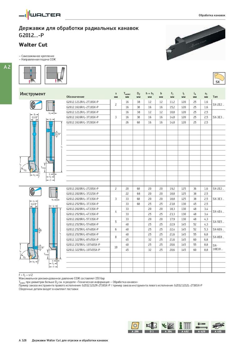 Обработка канавок Державки для обработки радиальных канавок G2012...-P Walter Cut – Самозажимное крепление – Направленная подача СОЖ A2 SX Инструмент s Tмакс D2 h = h1 b f1 l1 l4 s1 Обозначение мм мм мм мм мм мм мм мм мм Тип G2012.1212R/L-2T16SX-P 16 38 12 12 11,2 120 25 1,6 2 SX-2E2 .. G2012.1616R/L-2T16SX-P 16 38 16 16 15,2 120 25 1,6 h s1 G2012.1212R/L-3T16SX-P 16 38 12 12 10,8 120 25 2,5 G1/8'' b G2012.1616R/L-3T16SX-P 3 16 38 16 16 14,8 120 25 2,5 SX-3E3 .. G2012.1616R/L-3T26SX-P 26 68 16 16 14,8 120 25 2,5 G1/8'' l1 l4 Tmax D2 h1 s f1 f G2012.2020R/L-2T20SX-P 2 20 68 20 20 19,2 125 36 1,6 SX-2E2 .. G2012.2020R/L-3T22SX-P 22 68 20 20 18,8 125 38 2,5 s1 G2012.2020R/L-3T33SX-P 3 33 68 20 20 18,8 125 38 2,5 SX-3E3 .. h G1/8'' b G2012.2525R/L-3T33SX-P 33 68 25 25 23,8 130 45 2,5 G2012.2020R/L-4T33SX-P 33 20 20 18,3 130 48 3,4 4 SX-4E4 .. G2012.2525R/L-4T33SX-P 33 25 25 23,3 130 48 3,4 G2012.2020R/L-5T33SX-P 33 20 20 17,9 130 48 4,3 5 SX-5E5 .. G2012.2525R/L-5T40SX-P 40 25 25 22,9 145 52 4,3 M6 G2012.2525R/L-6T40SX-P 6 40 25 25 22,4 145 52 5,3 SX-6E6 .. l1 G2012.2525R/L-8T40SX-P 40 25 25 21,6 145 55 6,8 8 SX-8E8 .. G2012.3225R/L-8T45SX-P 45 32 25 21,6 145 60 6,8 G2012.2525R/L-10T40SX-P 40 25 25 20,6 145 55 8,8 SX- G1/8'' 10 10E10 .. l4 G2012.3225R/L-10T45SX-P 45 32 25 20,6 145 60 8,8 Tmax D2 h1 s f1 f f = f1 + s/2 Максимальное рекомендованное давление СОЖ составляет 150 бар Tмакс при диаметрах больше D2 см. в разделе «Техническая информация – Обработка канавок» Пример заказа инструмента правого исполнения: G2012.1212R-2T16SX-P / пример заказа инструмента левого исполнения: G2012.1212L-2T16SX-P Сборочные детали входят в комплект поставки A 286 D1 A 394 A 402 A 420 A 401 A 328 Державки Walter Cut для отрезки и обработки канавок