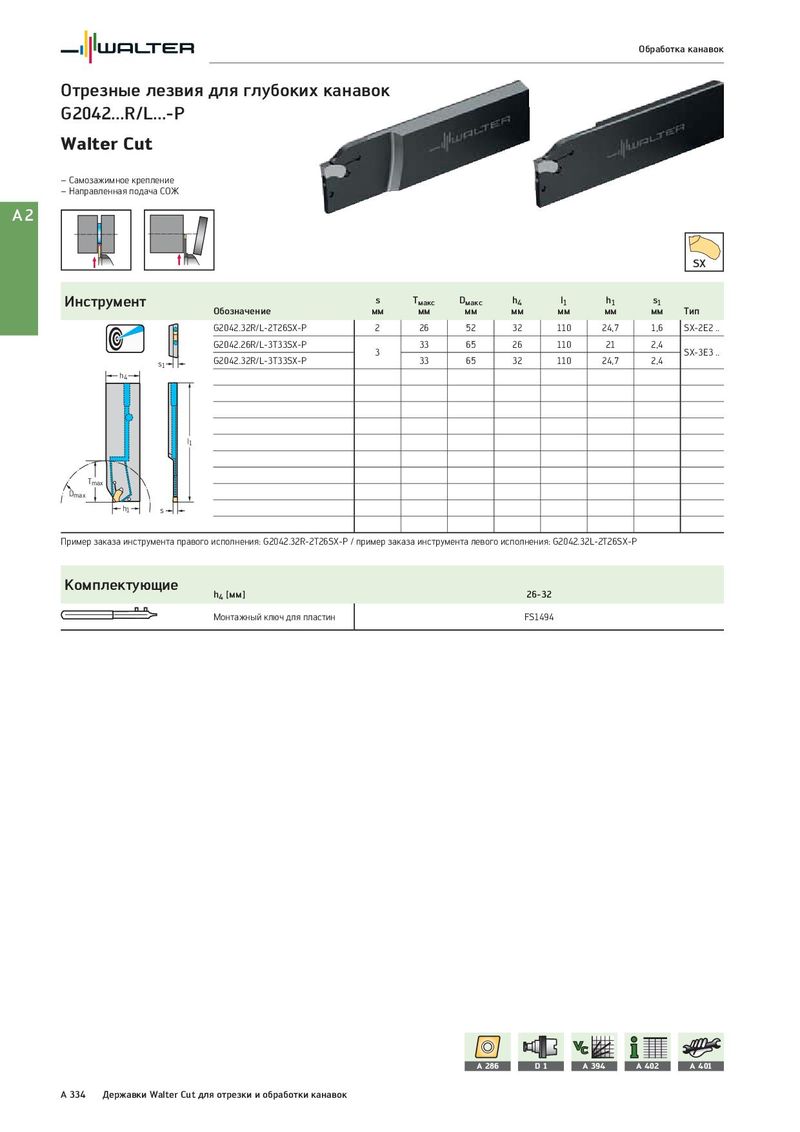 Обработка канавок Отрезные лезвия для глубоких канавок G2042...R/L...-P Walter Cut – Самозажимное крепление – Направленная подача СОЖ A2 SX Инструмент s Tмакс Dмакс h4 l1 h1 s1 Обозначение мм мм мм мм мм мм мм Тип G2042.32R/L-2T26SX-P 2 26 52 32 110 24,7 1,6 SX-2E2 .. G2042.26R/L-3T33SX-P 33 65 26 110 21 2,4 3 SX-3E3 .. s1 G2042.32R/L-3T33SX-P 33 65 32 110 24,7 2,4 h4 l1 Tmax Dmax h1 s Пример заказа инструмента правого исполнения: G2042.32R-2T26SX-P / пример заказа инструмента левого исполнения: G2042.32L-2T26SX-P Комплектующие h4 [мм] 26-32 Монтажный ключ для пластин FS1494 A 286 D1 A 394 A 402 A 401 A 334 Державки Walter Cut для отрезки и обработки канавок