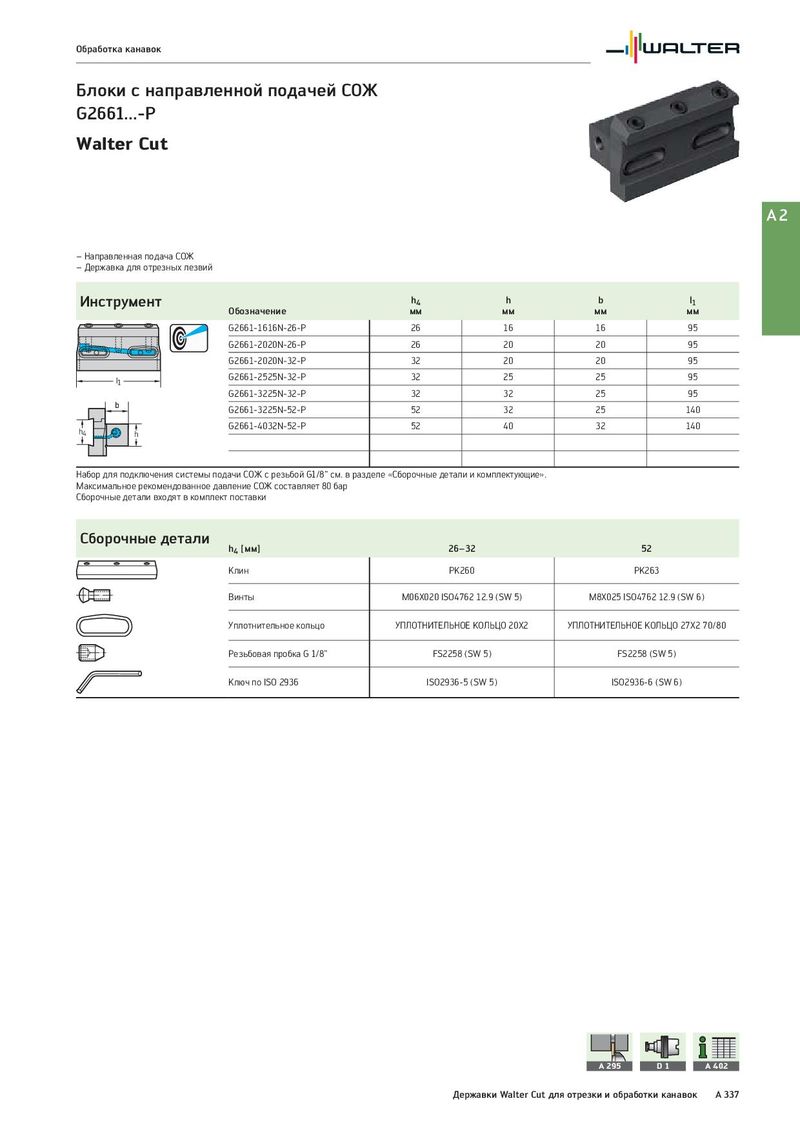 Обработка канавок Блоки с направленной подачей СОЖ G2661...-P Walter Cut A2 – Направленная подача СОЖ – Державка для отрезных лезвий Инструмент h4 h b l1 Обозначение мм мм мм мм G2661-1616N-26-P 26 16 16 95 G2661-2020N-26-P 26 20 20 95 G2661-2020N-32-P 32 20 20 95 G2661-2525N-32-P 32 25 25 95 G2661-3225N-32-P 32 32 25 95 G2661-3225N-52-P 52 32 25 140 h4 G2661-4032N-52-P 52 40 32 140 h Набор для подключения системы подачи СОЖ с резьбой G1/8“ см. в разделе «Сборочные детали и комплектующие». Максимальное рекомендованное давление СОЖ составляет 80 бар Сборочные детали входят в комплект поставки Сборочные детали h4 [мм] 26–32 52 Клин PK260 PK263 Винты M06X020 ISO4762 12.9 (SW 5) M8X025 ISO4762 12.9 (SW 6) Уплотнительное кольцо УПЛОТНИТЕЛЬНОЕ КОЛЬЦО 20X2 УПЛОТНИТЕЛЬНОЕ КОЛЬЦО 27X2 70/80 Резьбовая пробка G 1/8" FS2258 (SW 5) FS2258 (SW 5) Ключ по ISO 2936 ISO2936-5 (SW 5) ISO2936-6 (SW 6) A 295 D1 A 402 Державки Walter Cut для отрезки и обработки канавок A 337