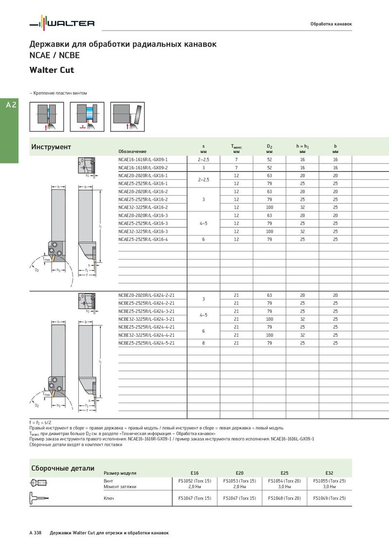 Обработка канавок Державки для обработки радиальных канавок NCAE / NCBE Walter Cut – Крепление пластин винтом A2 Инструмент s Tмакс D2 h = h1 b Обозначение мм мм мм мм мм NCAE16-1616R/L-GX09-1 2–2,5 7 52 16 16 NCAE16-1616R/L-GX09-2 3 7 52 16 16 s1 NCAE20-2020R/L-GX16-1 12 63 20 20 2–2,5 h b NCAE25-2525R/L-GX16-1 12 79 25 25 NCAE20-2020R/L-GX16-2 12 63 20 20 NCAE25-2525R/L-GX16-2 3 12 79 25 25 NCAE32-3225R/L-GX16-2 12 100 32 25 NCAE20-2020R/L-GX16-3 12 63 20 20 l1 NCAE25-2525R/L-GX16-3 4–5 12 79 25 25 NCAE32-3225R/L-GX16-3 12 100 32 25 NCAE25-2525R/L-GX16-4 6 12 79 25 25 Tmax s D2 h1 f1 f NCBE20-2020R/L-GX24-2-21 21 63 20 20 3 NCBE25-2525R/L-GX24-2-21 21 79 25 25 s1 NCBE25-2525R/L-GX24-3-21 21 79 25 25 4–5 h b NCBE32-3225R/L-GX24-3-21 21 100 32 25 NCBE25-2525R/L-GX24-4-21 21 79 25 25 6 NCBE32-3225R/L-GX24-4-21 21 100 32 25 NCBE25-2525R/L-GX24-5-21 8 21 79 25 25 l1 Tmax s D2 h1 f1 f f = f1 + s/2 Правый инструмент в сборе = правая державка + правый модуль / левый инструмент в сборе = левая державка + левый модуль Tмакс при диаметрах больше D2 см. в разделе «Техническая информация – Обработка канавок» Пример заказа инструмента правого исполнения: NCAE16-1616R-GX09-1 / пример заказа инструмента левого исполнения: NCAE16-1616L-GX09-1 Сборочные детали входят в комплект поставки Сборочные детали Размер модуля E16 E20 E25 E32 Винт FS1052 (Torx 15) FS1053 (Torx 15) FS1054 (Torx 20) FS1055 (Torx 25) Момент затяжки 2,0 Нм 2,0 Нм 3,0 Нм 3,0 Нм Ключ FS1047 (Torx 15) FS1047 (Torx 15) FS1048 (Torx 20) FS1049 (Torx 25) A 338 Державки Walter Cut для отрезки и обработки канавок
