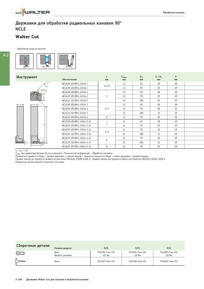 Обработка канавок Державки для обработки радиальных канавок 90° NCLE Walter Cut – Крепление пластин винтом A2 Инструмент s Tмакс D2 h = h1 b Обозначение мм мм мм мм мм NCLE20-2020R/L-GX16-1 12 63 20 20 D2 2–2,5 NCLE25-2525R/L-GX16-1 12 79 25 25 Tmax NCLE20-2020R/L-GX16-2 12 63 20 20 h1 NCLE25-2525R/L-GX16-2 3 12 79 25 25 NCLE32-3225R/L-GX16-2 12 100 32 25 h b NCLE20-2020R/L-GX16-3 12 63 20 20 NCLE25-2525R/L-GX16-3 4–5 12 79 25 25 NCLE32-3225R/L-GX16-3 12 100 32 25 NCLE25-2525R/L-GX16-4 6 12 79 25 25 NCLE20-2020R/L-GX24-2-21 21 63 20 20 l21 3 l1 NCLE25-2525R/L-GX24-2-21 21 79 25 25 NCLE25-2525R/L-GX24-3-21 21 79 25 25 4–5 NCLE32-3225R/L-GX24-3-21 21 100 32 25 s NCLE25-2525R/L-GX24-4-21 21 79 25 25 6 s1 NCLE32-3225R/L-GX24-4-21 21 100 32 25 f NCLE25-2525R/L-GX24-5-21 8 21 79 25 25 l1 = l21 + s/2 Tмакс при диаметрах больше D2 см. в разделе «Техническая информация – Обработка канавок» Правый инструмент в сборе = правая державка + левый модуль / левый инструмент в сборе = левая державка + правый модуль Пример заказа инструмента правого исполнения: NCLE20-2020R-GX16-1 / пример заказа инструмента левого исполнения: NCLE20-2020L-GX16-1 Сборочные детали входят в комплект поставки Сборочные детали Размер модуля E20 E25 E32 Винт FS1053 (Torx 15) FS1054 (Torx 20) FS1055 (Torx 25) Момент затяжки 2,0 Нм 3,0 Нм 3,0 Нм Ключ FS1047 (Torx 15) FS1048 (Torx 20) FS1049 (Torx 25) A 340 Державки Walter Cut для отрезки и обработки канавок