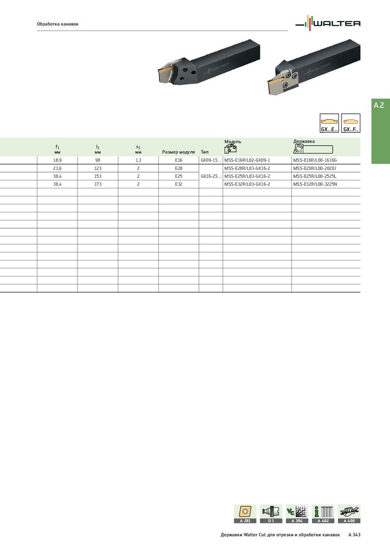 Обработка канавок A2 Модуль Державка f1 l1 s1 мм мм мм Размер модуля Тип 18,9 98 1,3 E16 GX09-1S .. MSS-E16R/L02-GX09-1 MSS-E16R/L00-1616G 23,6 123 2 E20 MSS-E20R/L03-GX16-2 MSS-E20R/L00-2020J 30,4 153 2 E25 GX16-2S .. MSS-E25R/L03-GX16-2 MSS-E25R/L00-2525L 30,4 173 2 E32 MSS-E32R/L03-GX16-2 MSS-E32R/L00-3225N A 281 D1 A 394 A 402 A 400 Державки Walter Cut для отрезки и обработки канавок A 343