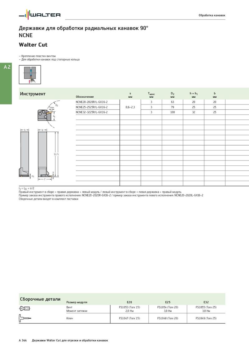 Обработка канавок Державки для обработки радиальных канавок 90° NCNE Walter Cut – Крепление пластин винтом – Для обработки канавок под стопорные кольца A2 Инструмент s Tмакс D2 h = h1 b Обозначение мм мм мм мм мм NCNE20-2020R/L-GX16-2 3 63 20 20 Tmax D2 NCNE25-2525R/L-GX16-2 0,6–2,3 3 79 25 25 NCNE32-3225R/L-GX16-2 3 100 32 25 h1 h b l21 l1 s s1 f l1 = l21 + s/2 Правый инструмент в сборе = правая державка + левый модуль / левый инструмент в сборе = левая державка + правый модуль Пример заказа инструмента правого исполнения: NCNE20-2020R-GX16-2 / пример заказа инструмента левого исполнения: NCNE20-2020L-GX16-2 Сборочные детали входят в комплект поставки Сборочные детали Размер модуля E20 E25 E32 Винт FS1053 (Torx 15) FS1054 (Torx 20) FS1055 (Torx 25) Момент затяжки 2,0 Нм 3,0 Нм 3,0 Нм Ключ FS1047 (Torx 15) FS1048 (Torx 20) FS1049 (Torx 25) A 344 Державки Walter Cut для отрезки и обработки канавок