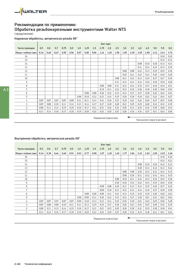 Резьбонарезание Рекомендации по применению: Обработка резьбонарезными инструментами Walter NTS (продолжение) Наружная обработка, метрическая резьба 60° Шаг [мм] Число проходов 0,5 0,6 0,7 0,75 0,8 1,0 1,25 1,5 1,75 2,0 2,5 3,0 3,5 4,0 4,5 5,0 5,5 6,0 Общая глубина [мм] 0,34 0,40 0,47 0,50 0,54 0,67 0,80 0,94 1,14 1,28 1,58 1,89 2,20 2,50 2,80 3,12 3,41 3,72 16 0,10 0,10 15 0,12 0,12 14 0,08 0,10 0,10 0,13 0,14 13 0,11 0,12 0,12 0,13 0,15 12 0,08 0,08 0,12 0,13 0,15 0,15 0,16 11 0,10 0,11 0,12 0,14 0,16 0,16 0,18 10 0,08 0,11 0,12 0,13 0,15 0,17 0,17 0,19 9 0,11 0,12 0,14 0,14 0,16 0,18 0,18 0,20 8 0,08 0,08 0,11 0,12 0,14 0,15 0,17 0,19 0,19 0,21 A3 7 0,10 0,11 0,12 0,13 0,15 0,16 0,18 0,20 0,20 0,22 6 0,08 0,08 0,10 0,12 0,13 0,14 0,17 0,17 0,20 0,22 0,22 0,24 5 0,08 0,10 0,12 0,12 0,14 0,15 0,16 0,18 0,19 0,22 0,24 0,24 0,27 4 0,07 0,07 0,07 0,07 0,08 0,11 0,11 0,14 0,14 0,16 0,17 0,18 0,21 0,22 0,24 0,27 0,27 0,30 3 0,07 0,08 0,10 0,11 0,12 0,13 0,14 0,17 0,17 0,18 0,20 0,21 0,25 0,25 0,28 0,32 0,32 0,35 2 0,09 0,11 0,14 0,15 0,16 0,16 0,17 0,21 0,21 0,24 0,24 0,26 0,31 0,32 0,34 0,39 0,40 0,43 1 0,11 0,14 0,16 0,17 0,18 0,19 0,20 0,22 0,22 0,25 0,27 0,28 0,34 0,34 0,37 0,41 0,43 0,46 Радиальная подача [мм] Уменьшение скорости резания Внутренняя обработка, метрическая резьба 60° Шаг [мм] Число проходов 0,5 0,6 0,7 0,75 0,8 1,0 1,25 1,5 1,75 2,0 2,5 3,0 3,5 4,0 4,5 5,0 5,5 6,0 Общая глубина [мм] 0,34 0,38 0,44 0,48 0,51 0,63 0,77 0,90 1,07 1,20 1,49 1,77 2,04 2,32 2,62 2,89 3,20 3,46 16 0,10 0,10 15 0,12 0,12 14 0,08 0,10 0,10 0,12 0,13 13 0,10 0,11 0,12 0,13 0,14 12 0,08 0,08 0,10 0,12 0,14 0,14 0,15 11 0,09 0,10 0,11 0,12 0,14 0,14 0,15 10 0,08 0,10 0,11 0,12 0,13 0,15 0,15 0,16 9 0,10 0,10 0,12 0,12 0,14 0,15 0,16 0,18 8 0,08 0,08 0,10 0,11 0,13 0,13 0,15 0,16 0,17 0,19 7 0,09 0,10 0,11 0,12 0,14 0,14 0,16 0,17 0,18 0,20 6 0,08 0,08 0,09 0,11 0,12 0,13 0,15 0,15 0,19 0,20 0,20 0,22 5 0,08 0,09 0,11 0,10 0,12 0,13 0,14 0,17 0,18 0,21 0,22 0,22 0,24 4 0,07 0,07 0,07 0,07 0,07 0,09 0,10 0,13 0,13 0,14 0,15 0,16 0,19 0,21 0,23 0,25 0,26 0,28 3 0,07 0,08 0,08 0,10 0,11 0,11 0,13 0,15 0,15 0,17 0,18 0,20 0,23 0,24 0,27 0,30 0,32 0,35 2 0,09 0,11 0,13 0,14 0,15 0,16 0,17 0,21 0,21 0,23 0,25 0,26 0,30 0,31 0,33 0,38 0,38 0,41 1 0,11 0,12 0,16 0,17 0,18 0,19 0,20 0,22 0,22 0,25 0,27 0,28 0,32 0,33 0,36 0,41 0,41 0,44 Радиальная подача [мм] Уменьшение скорости резания A 462 Техническая информация